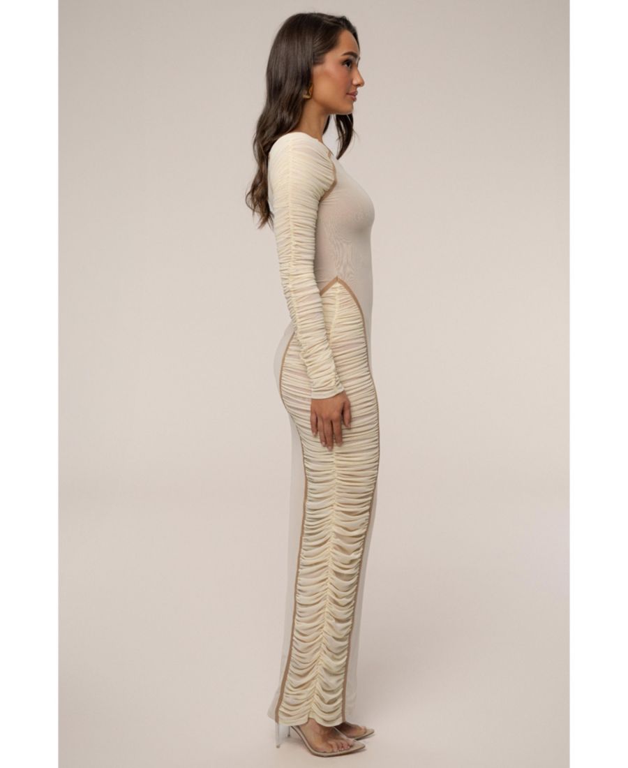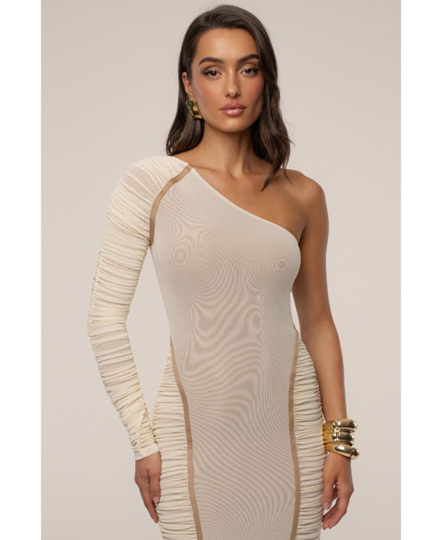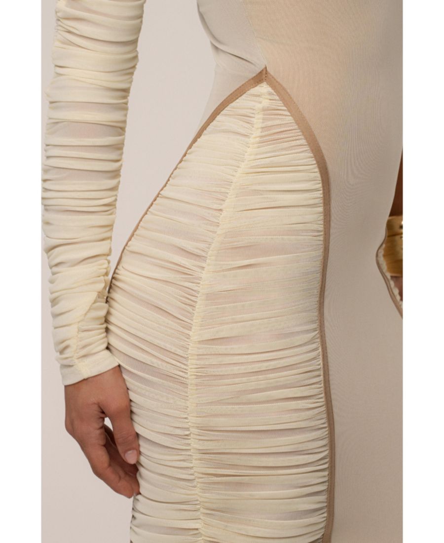 Превратите каждое появление в эффектное событие с нашим макси-платьем Rachel. Это прозрачное сетчатое макси-платье с силуэтом на одно плечо украшено сборками по всей поверхности, создающими привлекательный, облегающий силуэт. Контрастная отделка телесного цвета подчеркивает изгибы тела, добавляя смелый акцент, а разрез сзади обеспечивает свободу движений. Эластичный материал.