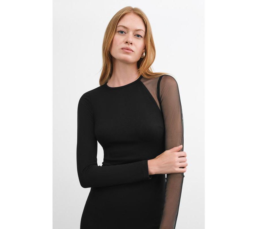 Примерно 96 см в длину Длинные рукава, один из которых прозрачный Круглый вырез горловины Приталенный крой, немного тянется Разработано в Нью-Йорке | Изготовлено вручную в Европе Информация о размерах: Соответствует размеру Приталенный крой в области груди, талии и бедер, прямой силуэт, мини-длина Слегка тянется Общая длина составляет примерно 95,5 см. Длина рукава составляет примерно 61,5 см Эмми ростом 179 см, носит размер XS Ткань понте: 60% вискоза, 30% полиамид, 10% лайкра / Сетка: 95% полиэстер, 5% эластан / Трикотаж: 96% тенсел, 4% эластан Ручная стирка Импортный товар
