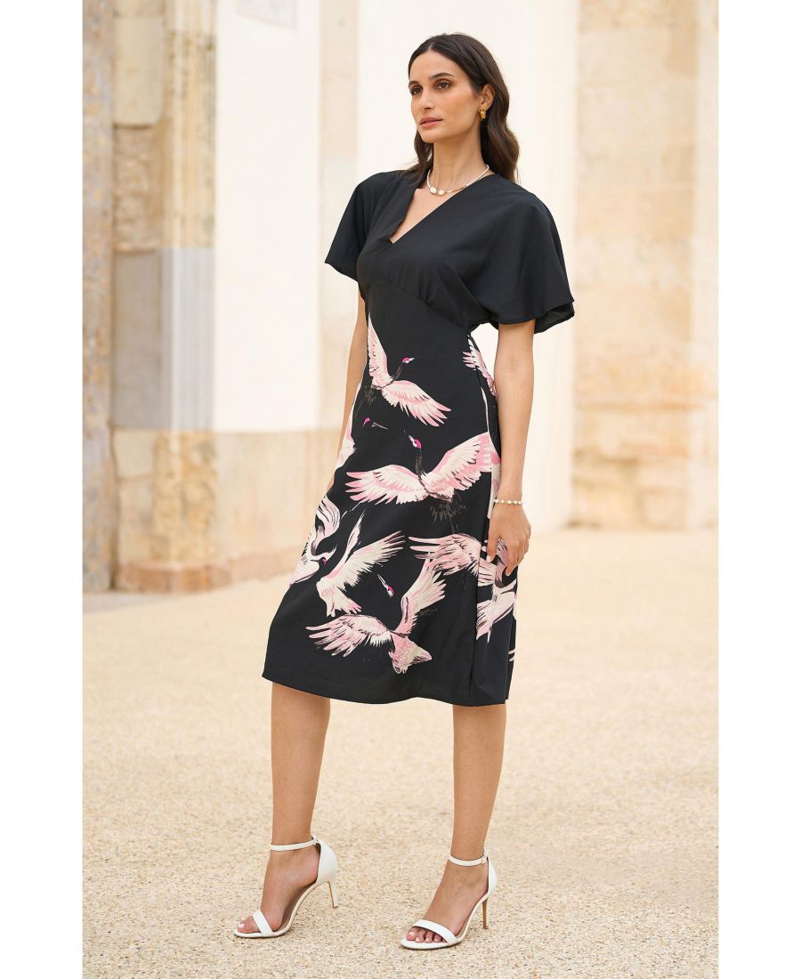 Что может быть лучше, чем новая интерпретация классического силуэта? А как насчет роскошного принта с изображением журавлей, разработанного с любовью нашими дизайнерами? Сверхмягкая, легкая ткань этого платья миди свободно ниспадает до колена, дополненная расклешенными рукавами и изящным V-образным вырезом. Не удивляйтесь, если вы привлечете всеобщее внимание.