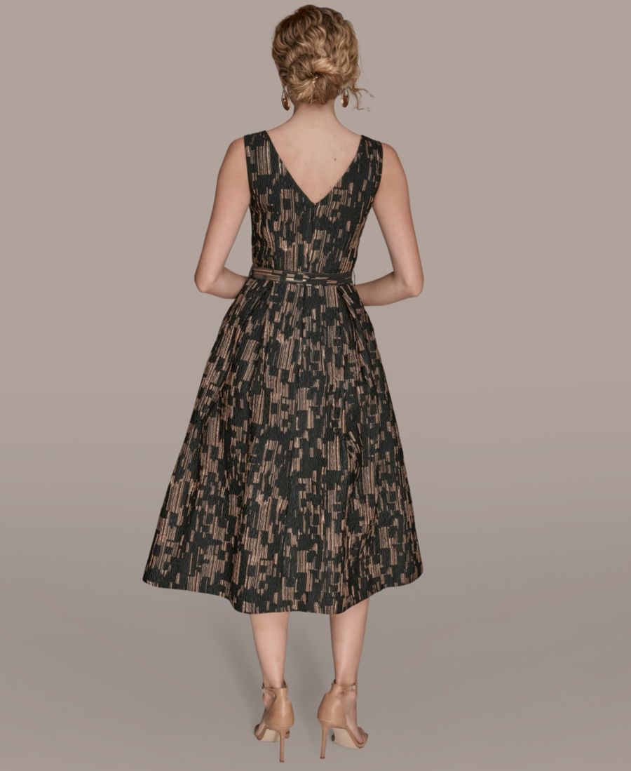 Это платье от Donna Karan New York, представляющее собой поразительное сочетание современного принта и струящегося кроя, уверенно подчеркивает фигуру. Отсутствие рукавов обеспечивает комфорт и воздушность, а V-образный вырез визуально удлиняет декольте. Силуэт приталенный и расклешенный подчеркивает талию и добавляет женственности каждому шагу.