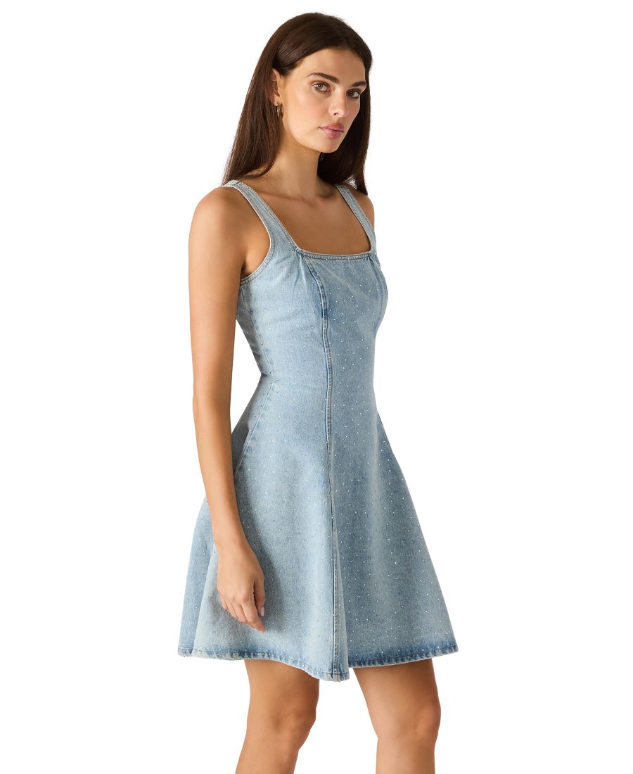 Женственное и непринужденно стильное мини-платье Steve Madden Ameela без рукавов, приталенного силуэта и расклешенной юбки, выполнено из украшенного твидового денима. Этот очаровательный силуэт отличается привлекательным квадратным вырезом и застегивается на молнию по центру спины. Платье без подкладки, легкое и удобное, не сковывает движений.