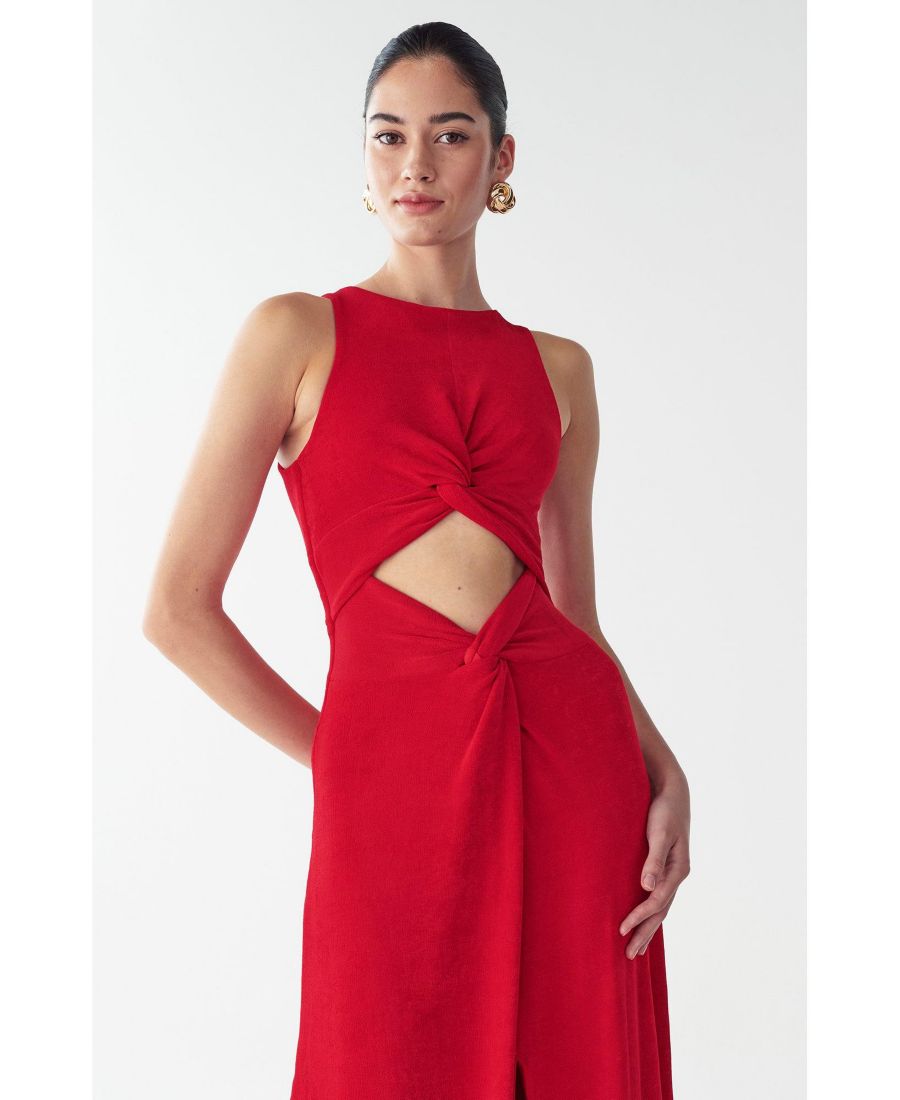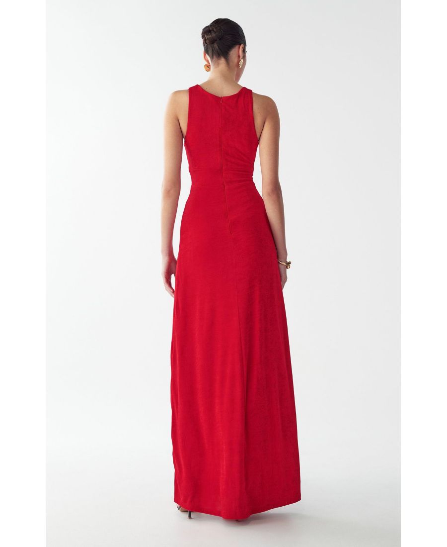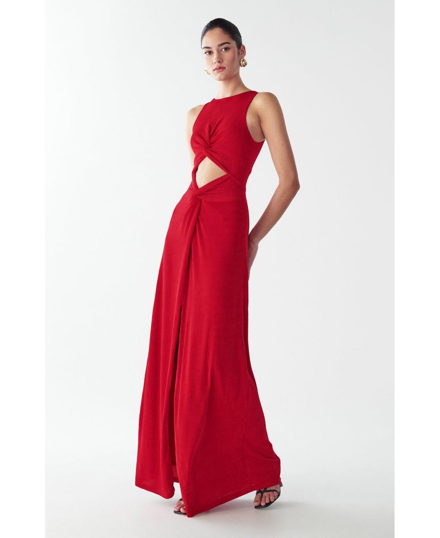 Платье-макси MALIA от ST MRLO - это эффектное красное платье в пол, которое привлекает внимание смелыми вырезами и элегантной драпировкой. Это платье без рукавов преображает вечерний образ благодаря изысканной конструкции с перекрученным передом и стратегически расположенным открытым вставкам, создающим современный, утонченный стиль.