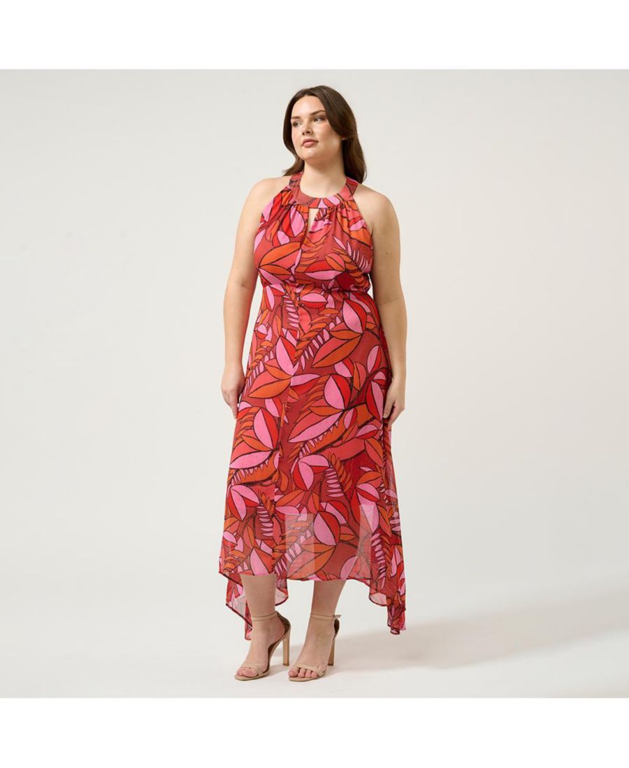 Привлеките всеобщее внимание в этом ярком оранжево-розовом платье с цветочным принтом. Платье с асимметричным подолом, воротником-халтером и завышенной талией непременно подарит вам ощущение роскоши. Для торжественных случаев сочетайте его с туфлями на каблуках и клатчем, а для более непринужденного образа - с сандалиями.