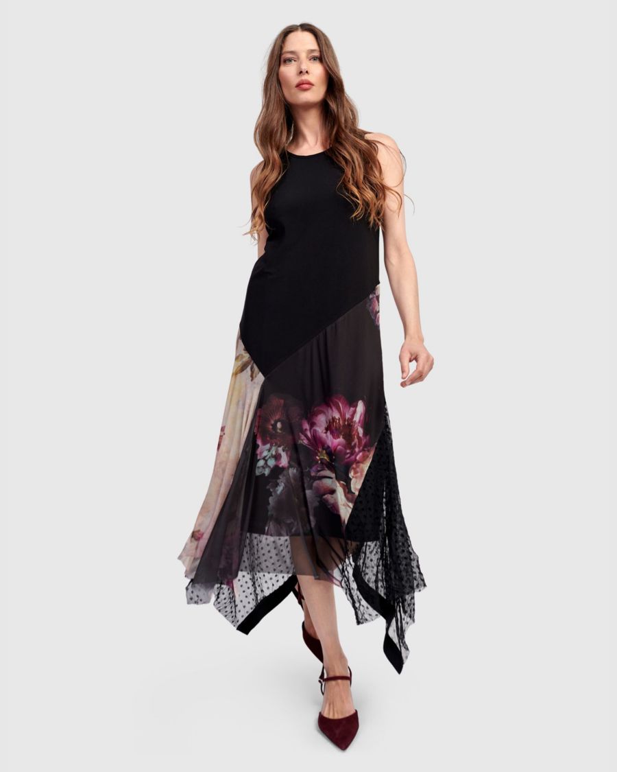 Многослойность шелковистой ткани с комбинированным принтом, полупрозрачная юбка и удобный лиф из эластичного трикотажа создают образ в стиле флэппер. Это платье миди имеет круглый вырез, облегающий крой и мягкий А-образный силуэт, а также удобный для ношения с бюстгальтером крой без рукавов. В комплекте идет нижняя юбка.