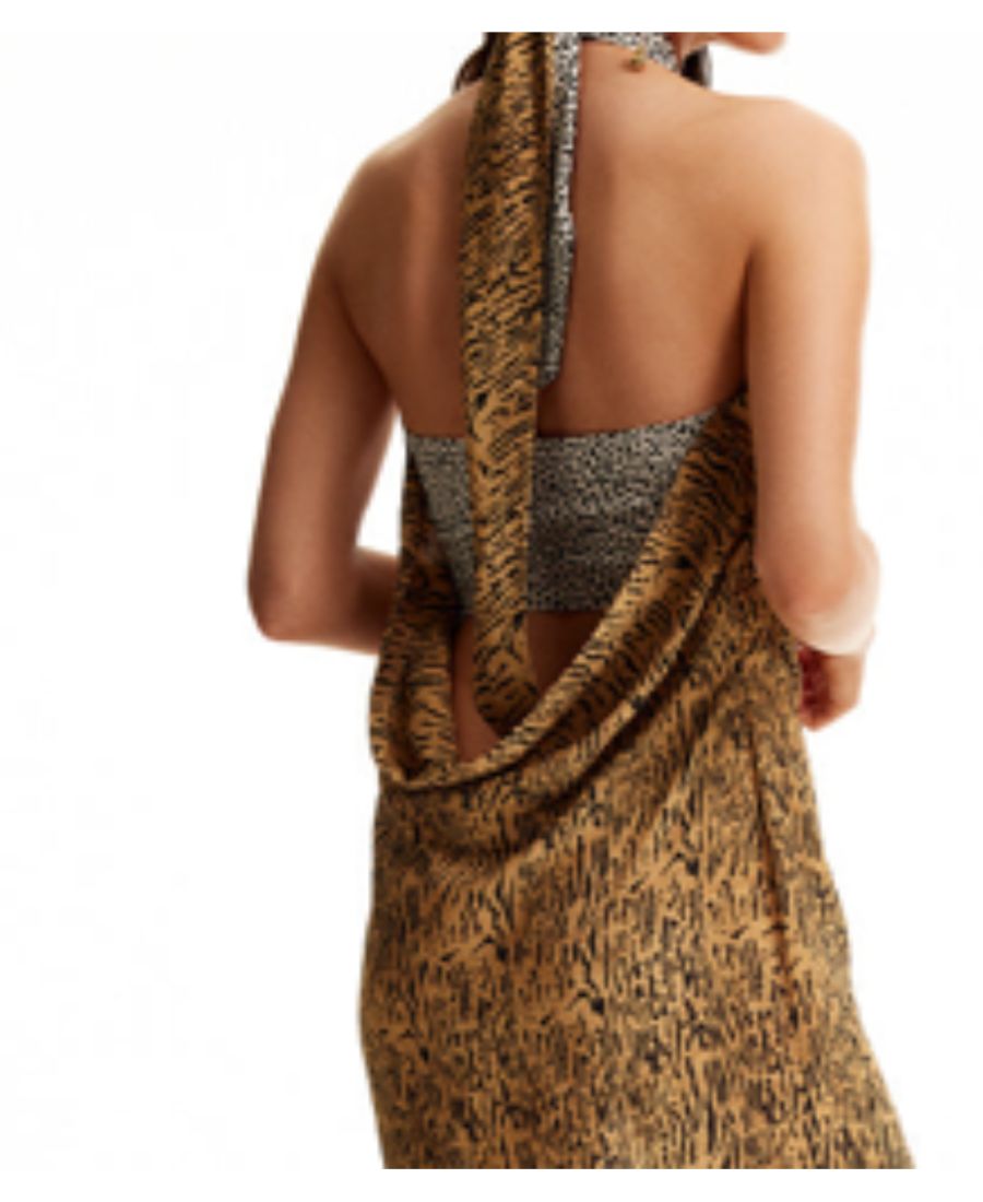 Длинное платье без подкладки с воротником-халтером, драпированной открытой спинкой, тканью с анималистическим принтом и разрезом сзади для свободы движений. Легко надевается. Длина: 64,57 дюйма.