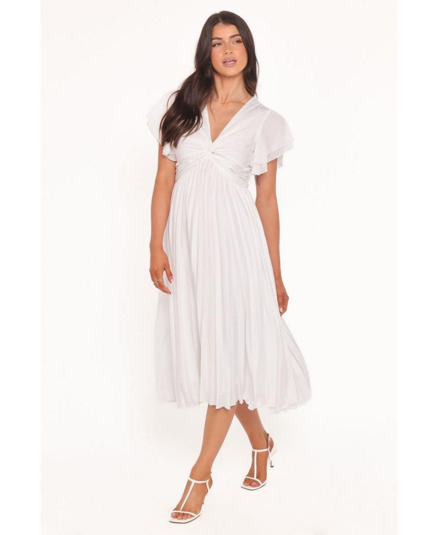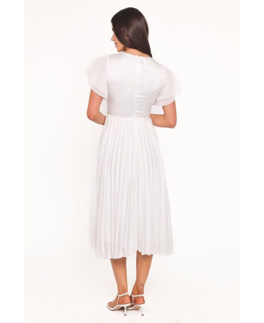 Платье Nova с рукавами-крылышками - это сочетание элегантности и непринужденности. Длина миди и плиссированная юбка создают вневременной силуэт, а рукава-крылышки и V-образный вырез добавляют очарования. Благодаря потайной молнии сзади и надежной застежке, это платье легко надевать и сочетать с другими вещами.