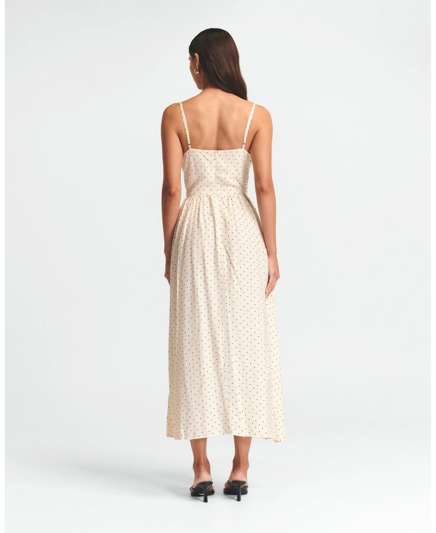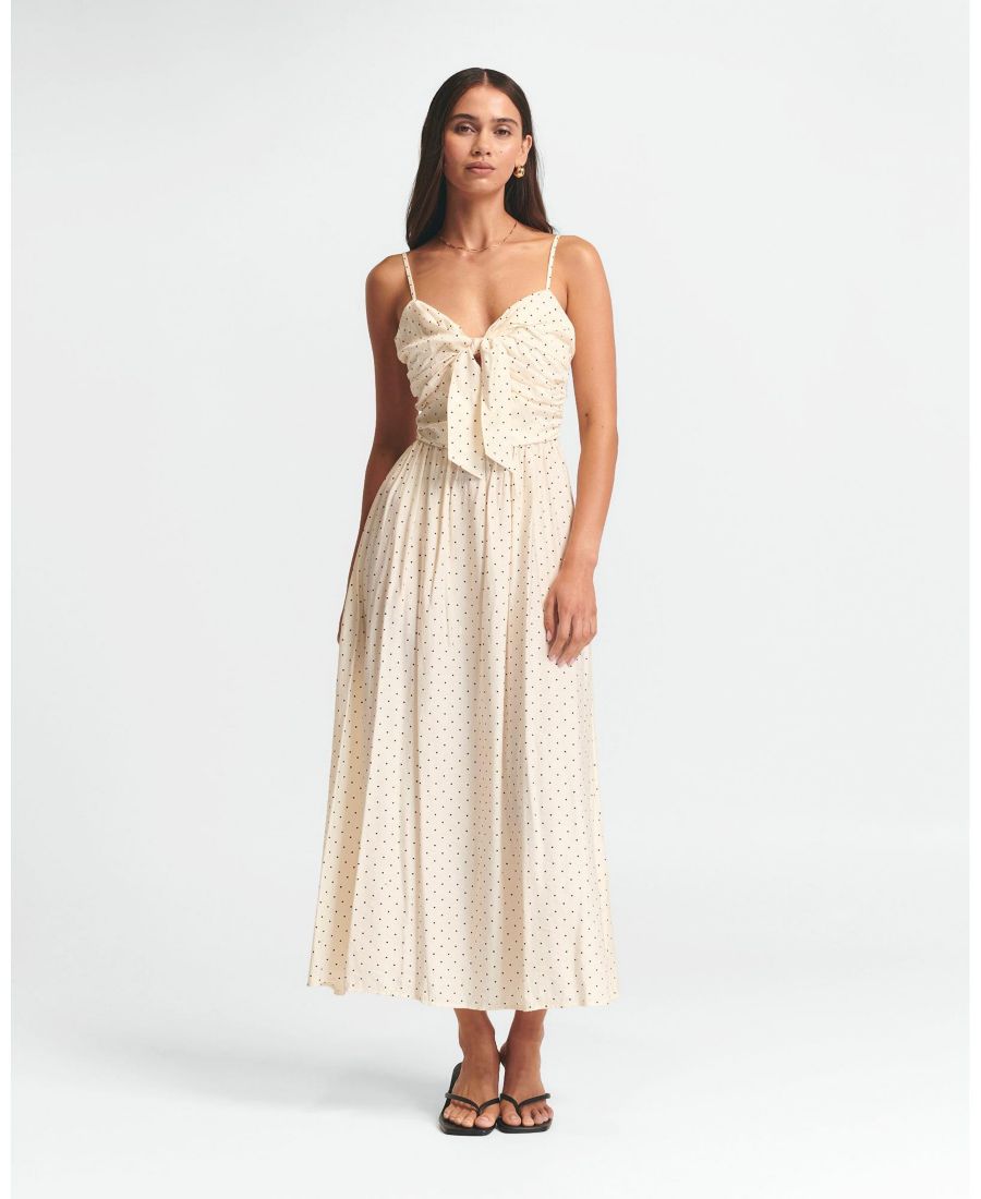 Платье Baylen Midi от ST MRLO - это тканое платье средней длины, воплощающее непринужденную летнюю элегантность. Изящно выполненное с очаровательным принтом в горошек и женственным бантом на лифе, это платье предлагает романтичный и расслабленный силуэт, идеально подходящий для мероприятий в теплую погоду.