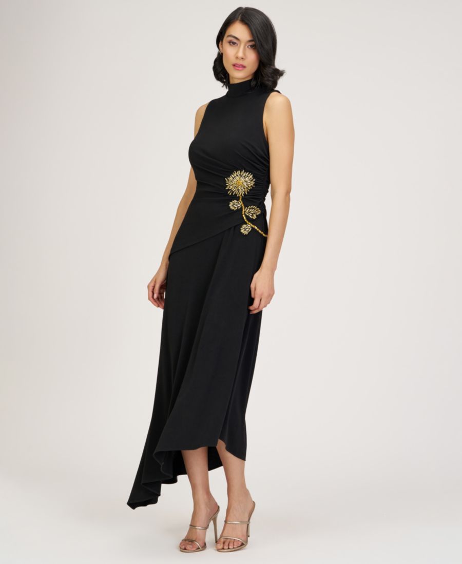 В этом потрясающем платье от JS Collections вы будете выглядеть великолепно благодаря изысканному воротнику-стойке и позолоченной цветочной аппликации. Асимметричный подол добавляет объема, а застежка-молния сзади обеспечивает надежную и элегантную посадку, идеально подходящую для торжественных случаев.
