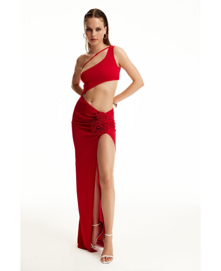 Застежка на резинке. Без подкладки. Примерная длина юбки: 114 см x 56 см. Укороченный топ на одно плечо с соответствующей юбкой с высоким разрезом, украшенной розочками. Эластичная ткань для облегающего силуэта. Идеально подходит для вечерних мероприятий.