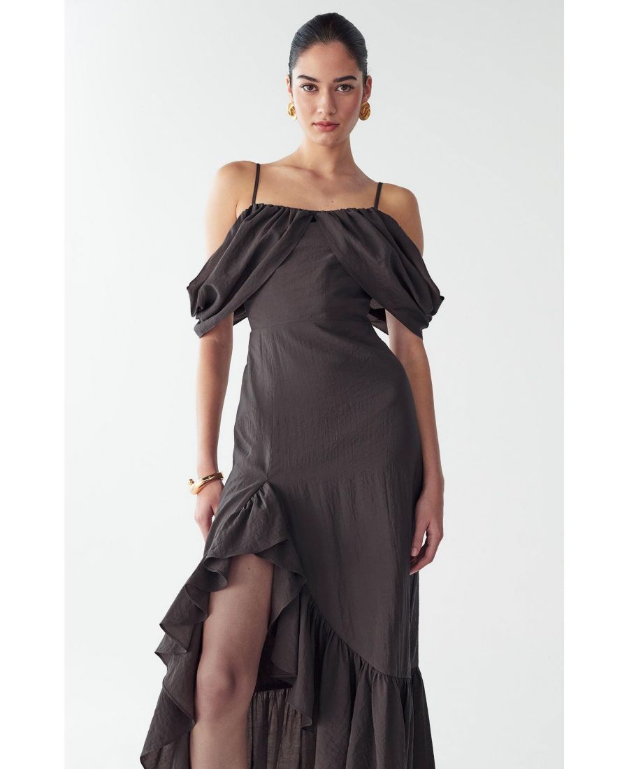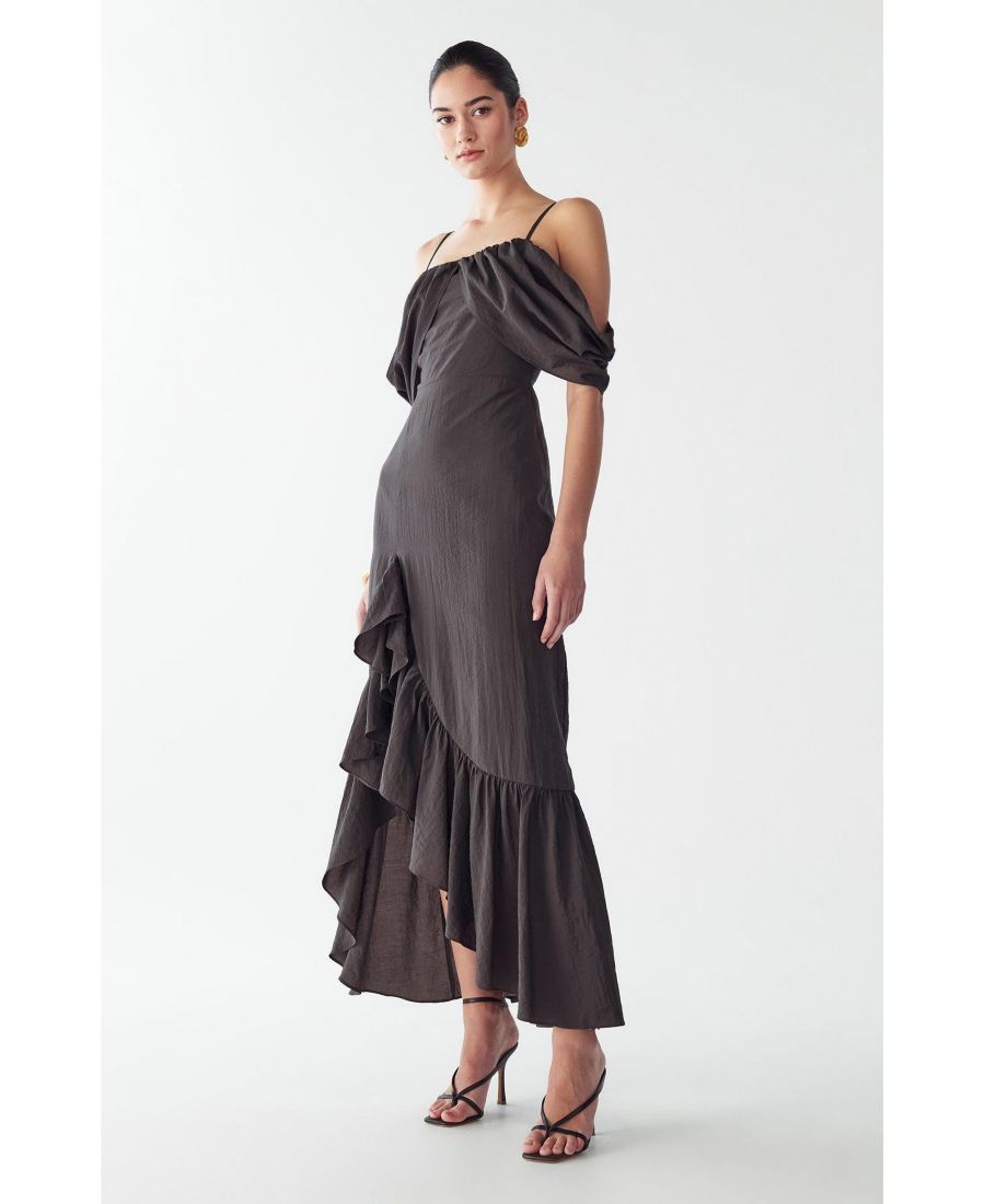 Платье SHELLY MAXI от ST MRLO - это очаровательное тканое платье макси, воплощающее непринужденную прибрежную элегантность. Благодаря эффектным рукавам, открывающим плечи, и чувственному асимметричному подолу с оборками, это платье добавит изысканности и эффектности вашим летним мероприятиям.