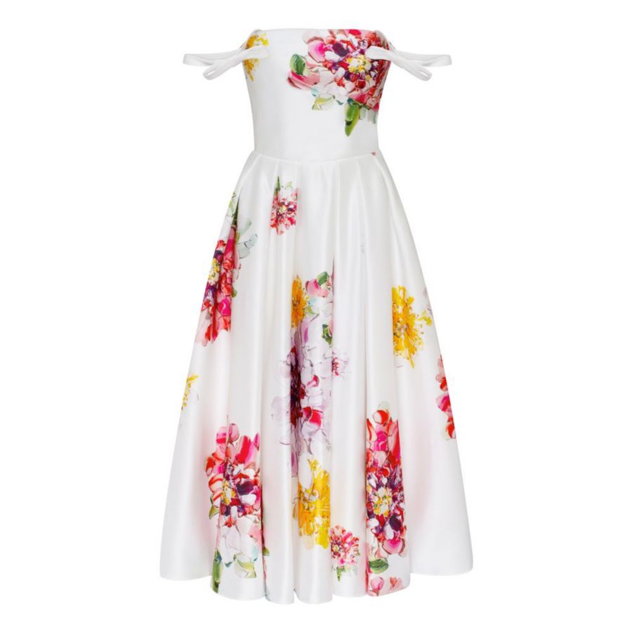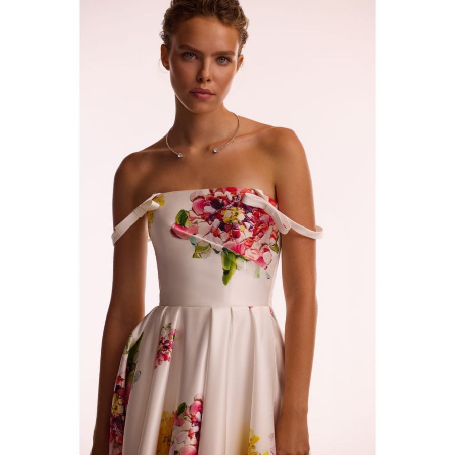 Это очаровательное платье миди - идеальный выбор для любого особого случая. Сшитое из атласной ткани с ярким цветочным узором, это платье имеет облегающий прямой лиф, съемные изящные бретельки, спускающие плечи, застежку на шнуровке и юбку миди с карманами для дополнительной практичности.