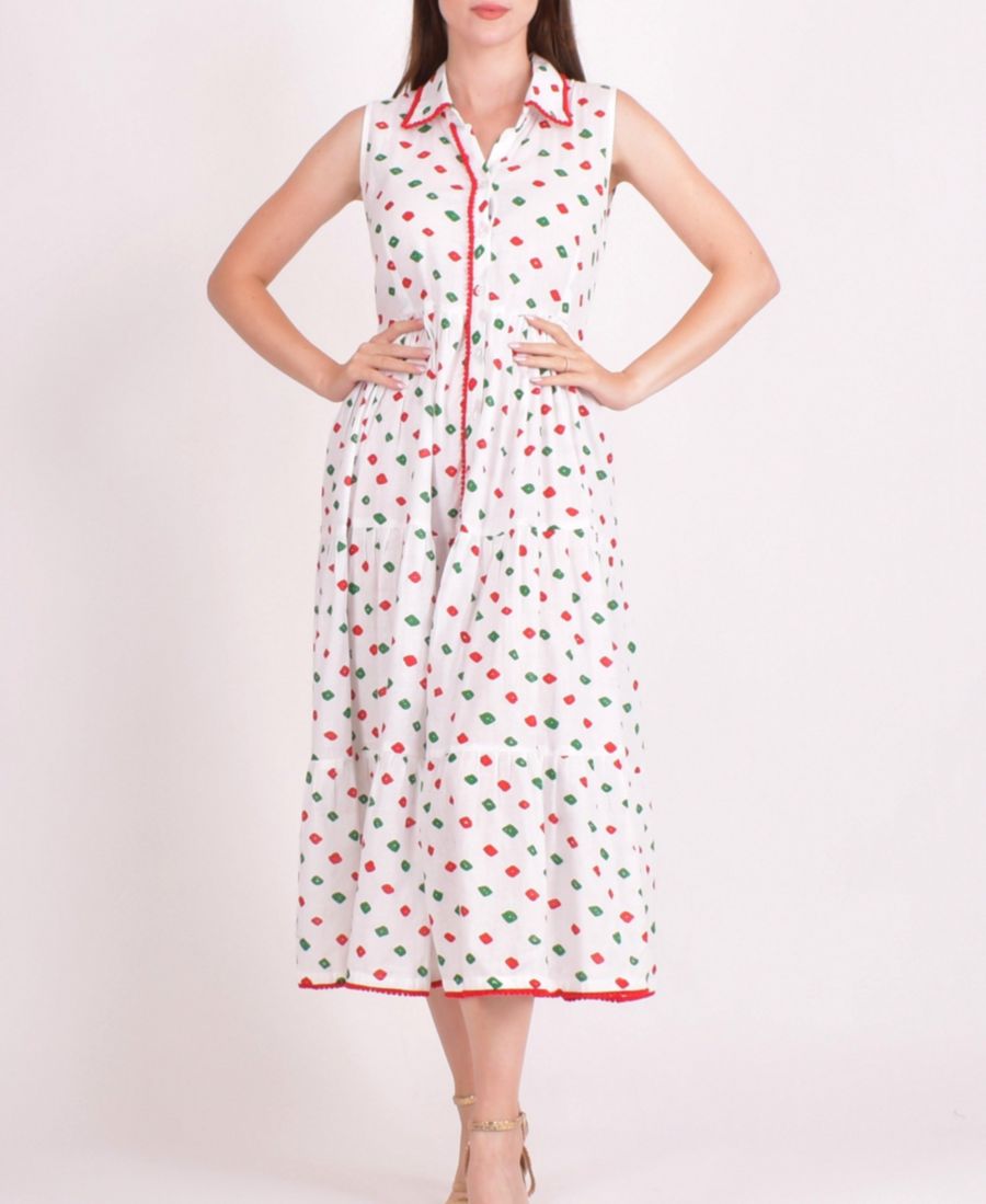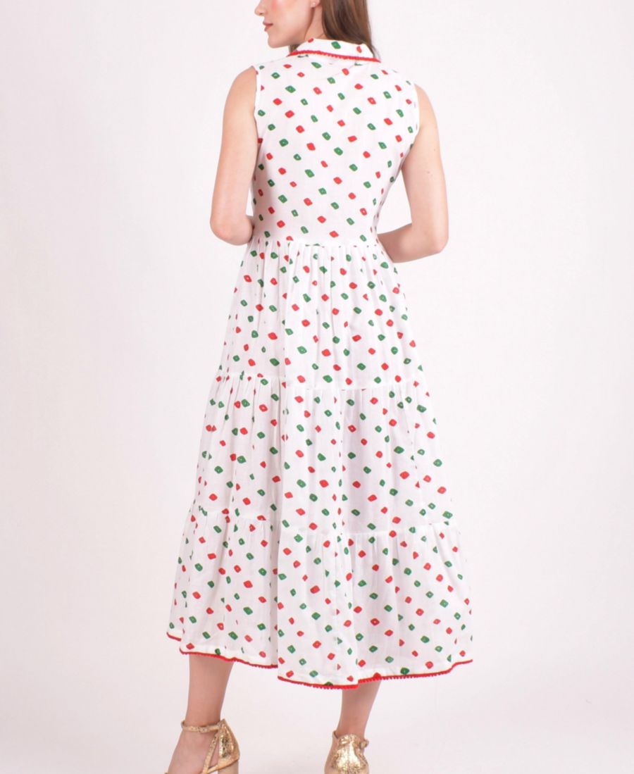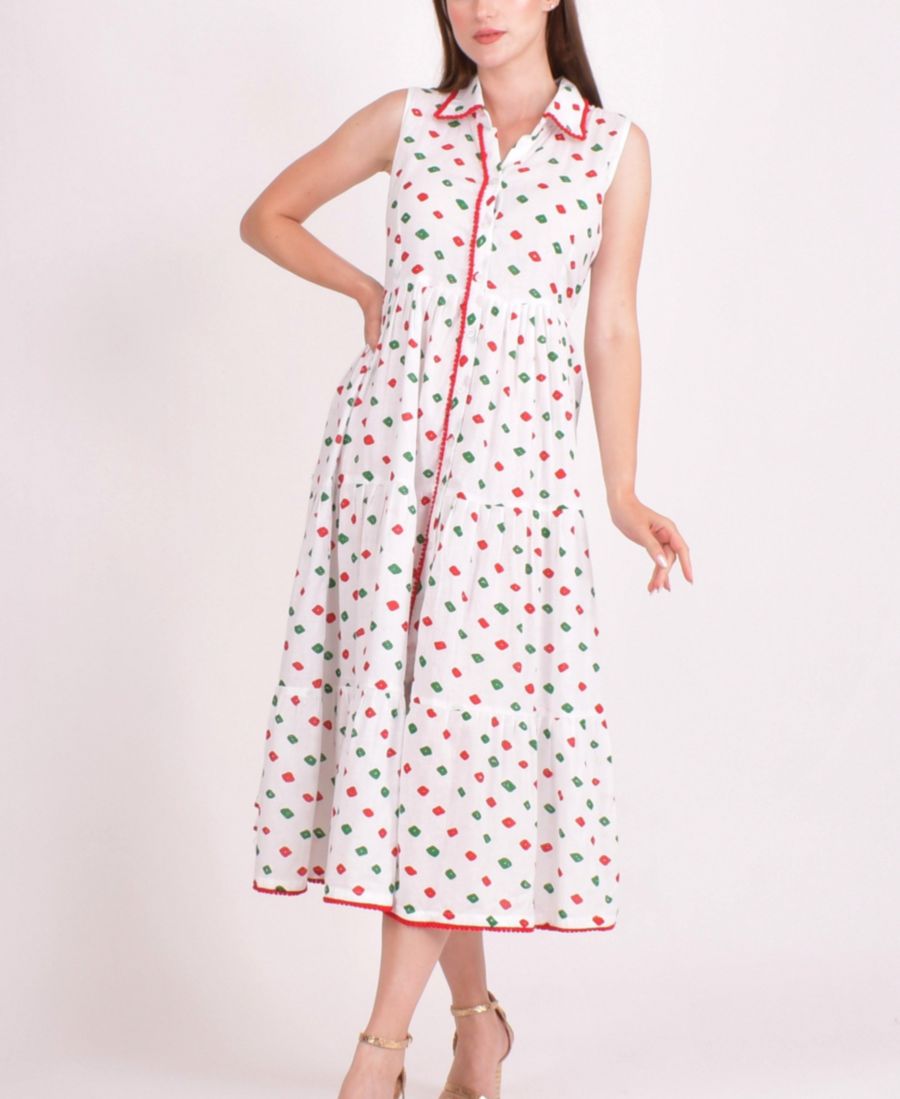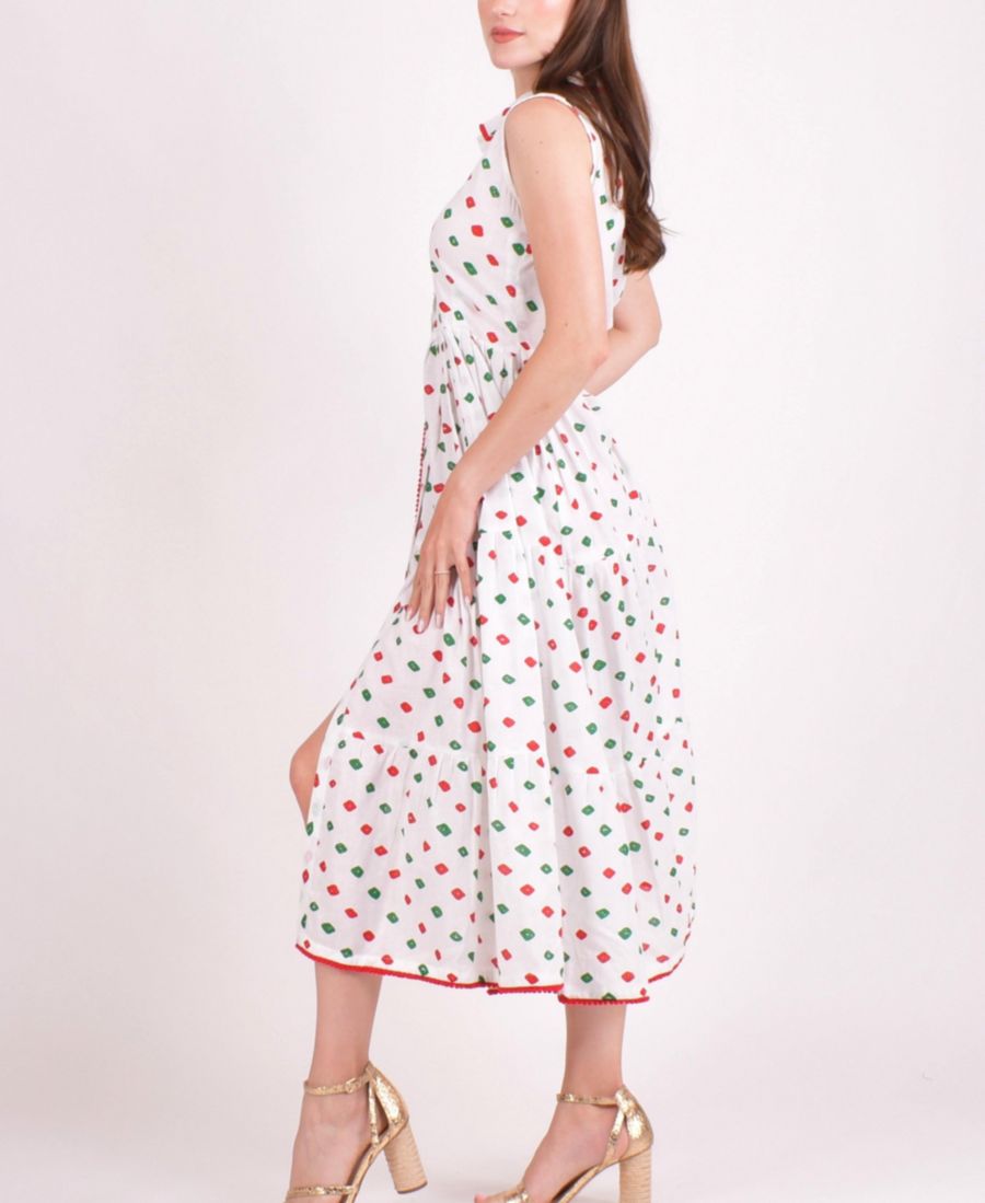 Платье-миди Olinda из хлопка с ярусным кроем - это белое хлопковое платье, украшенное игривыми красными и зелеными точками и очаровательными помпонами. Легкое, дышащее и невероятно элегантное, это платье-миди с ярусным кроем идеально подходит для дневных мероприятий и летних праздников.