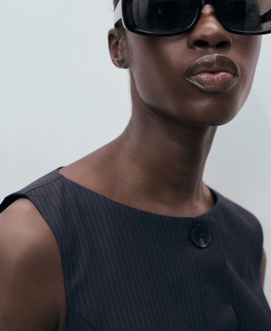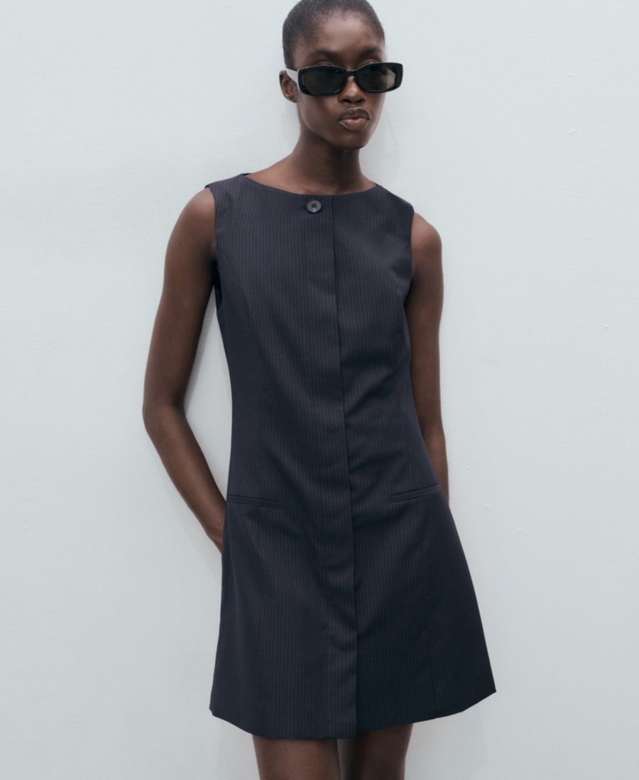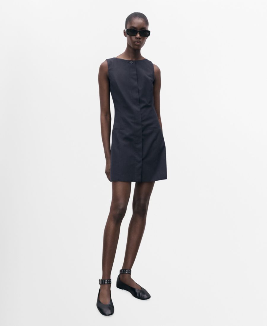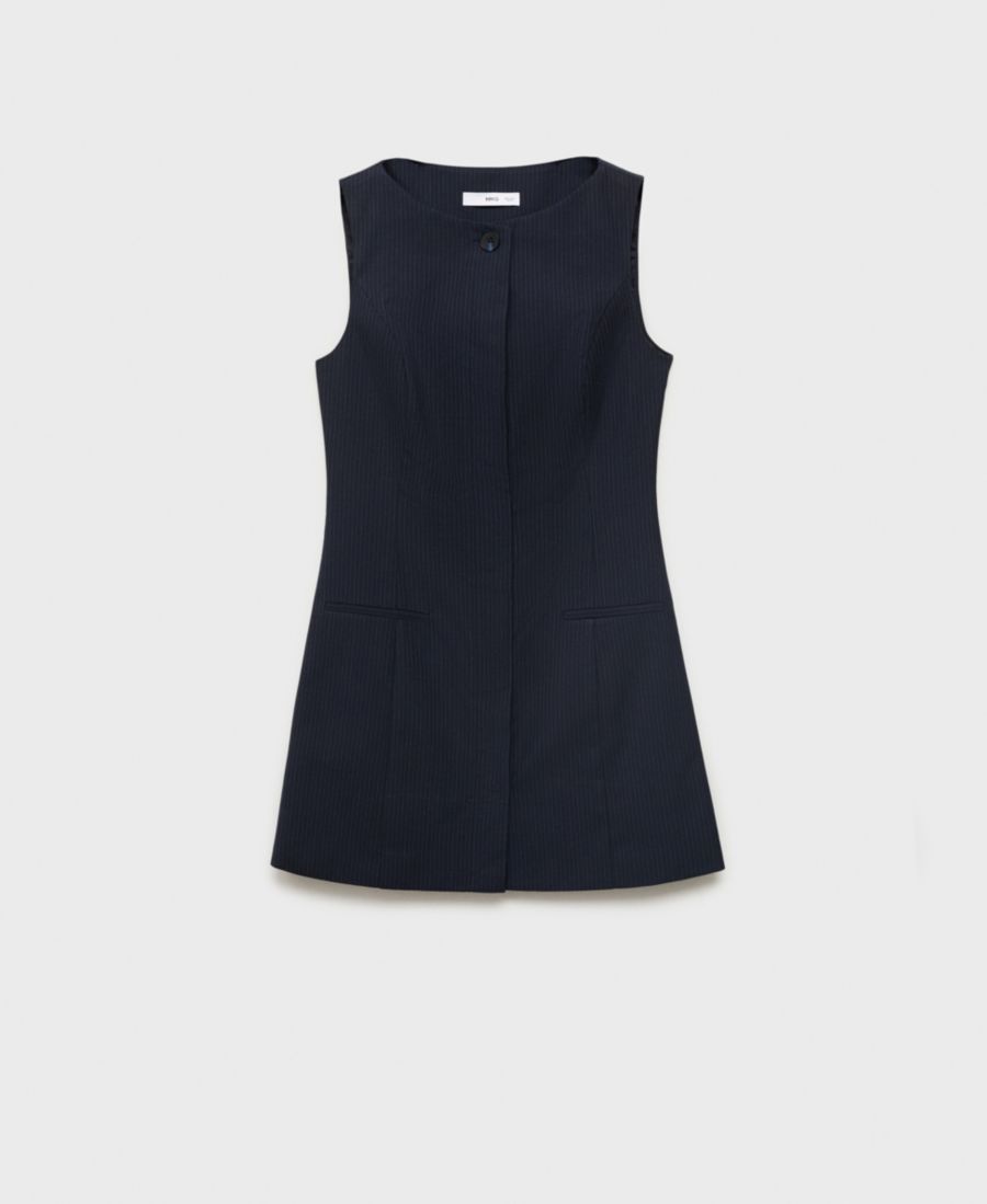 Платье в тонкую полоску с потайными пуговицами от Mango отличается изящными линиями. Это короткое платье прямого кроя в тонкую полоску, без рукавов, с широкими бретелями, двумя передними прорезными карманами и застежкой на пуговицы спереди, потайной планкой и внутренней подкладкой.
