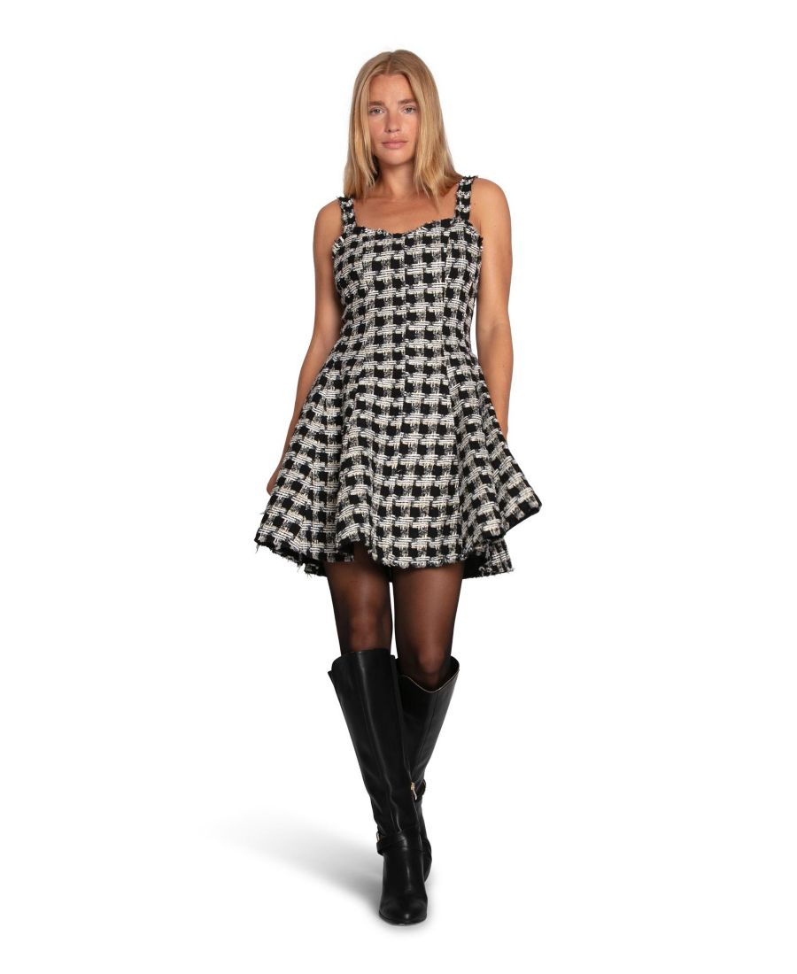 Превратите повседневные моменты в стильные образы с помощью этого потрясающего мини-платья. Классический вырез в форме сердца и элегантные бахромчатые края по бретелям и подолу делают эту современную интерпретацию вневременного стиля идеальным сочетанием кокетства и утонченности.