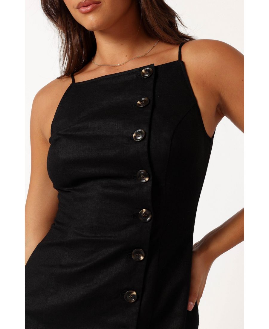 Почувствуйте себя стильно в нашем льняном мини-платье Allegra. Дизайн без рукавов обеспечивает идеальный баланс комфорта и стиля. Благодаря высокому прямому вырезу, нерегулируемым бретелям и функциональным пуговицам спереди, это платье идеально подходит для повседневной носки.