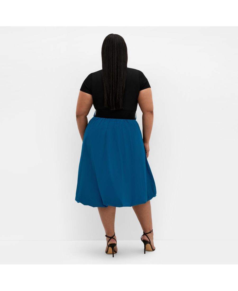 Вытачки на груди для придания формы, съемный эластичный пояс, эластичная талия, юбка-трапеция А-силуэта, функциональные боковые карманы, пышный подол миди, полуподкладка