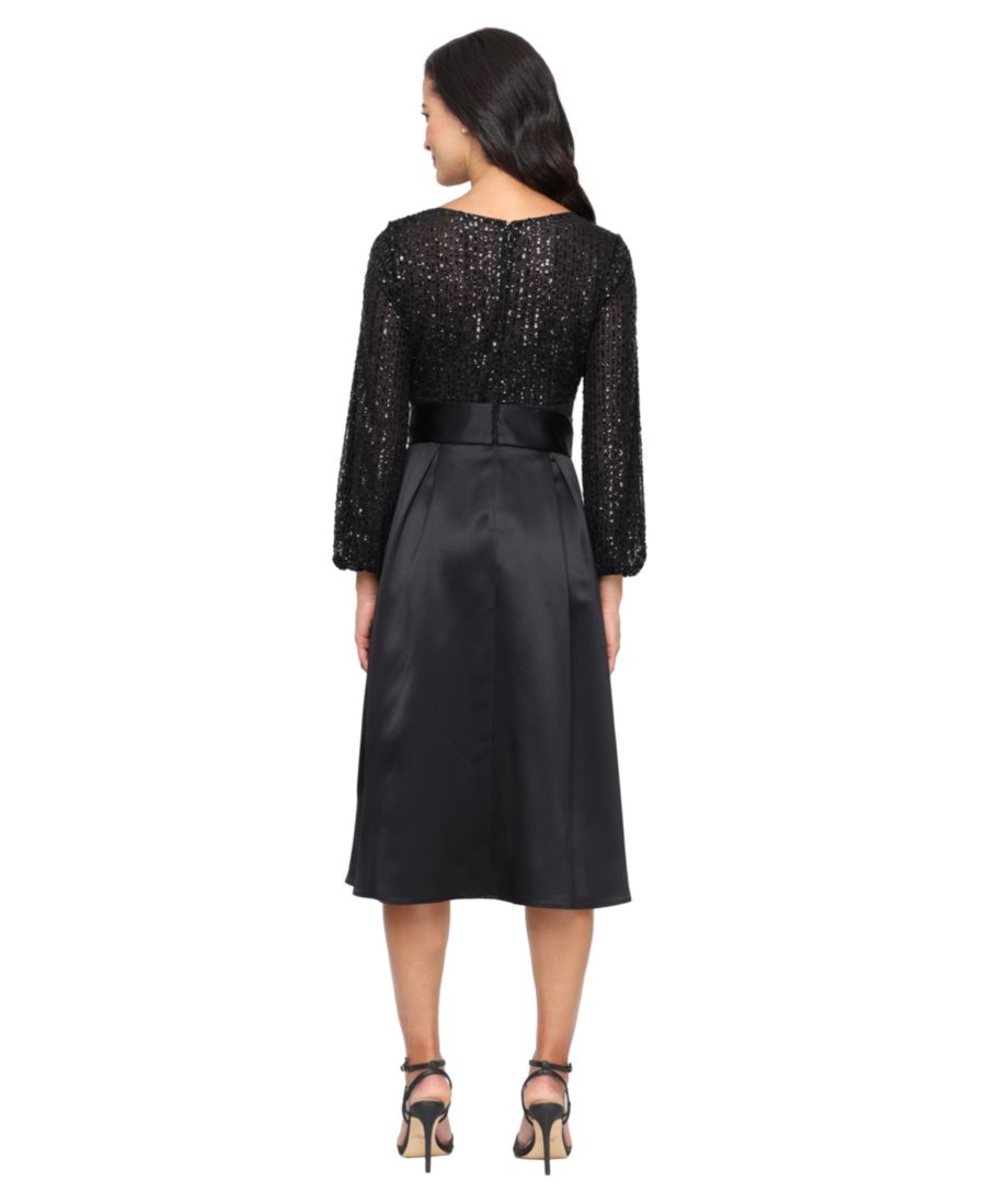 Это вечернее платье миди от Alex Evenings, выполненное в струящемся А-образном силуэте с лифом, украшенным пайетками, имеет атласную юбку и пояс на талии для большей выразительности. Вырез-лодочка придает платью классический и элегантный вид для торжественного случая.