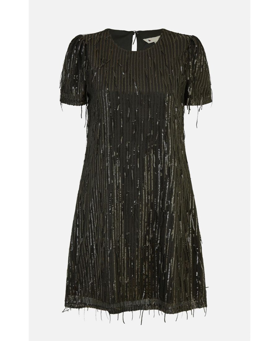 Незаменимый элемент гардероба для приглашений на праздничные мероприятия. Это платье-туника великолепно смотрится на любой фигуре, украшено ослепительными пайетками, которые создают потрясающий эффект. Добавьте туфли на каблуках, и вы готовы отправиться на вечеринку!