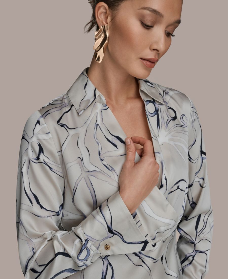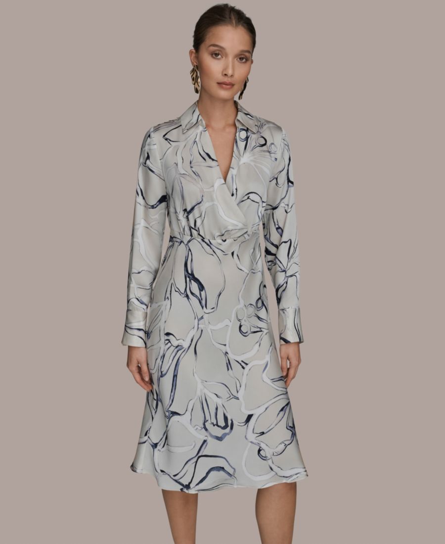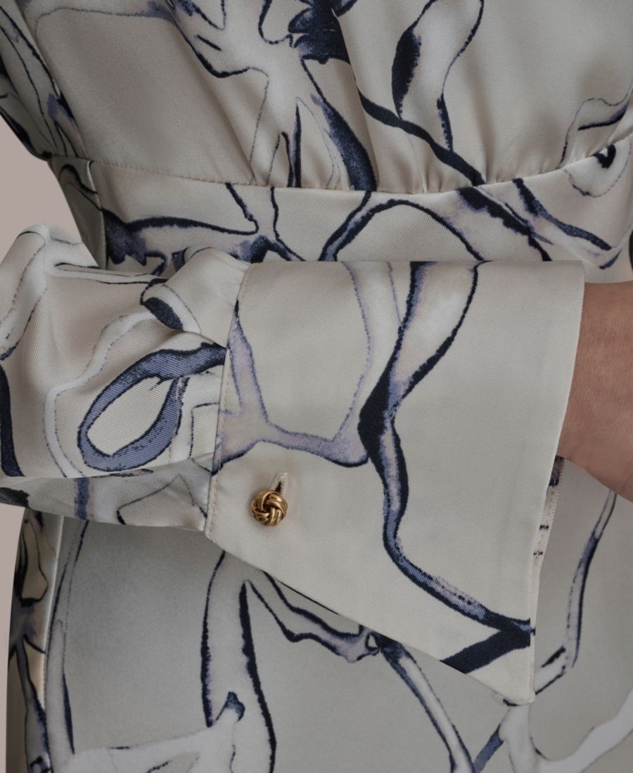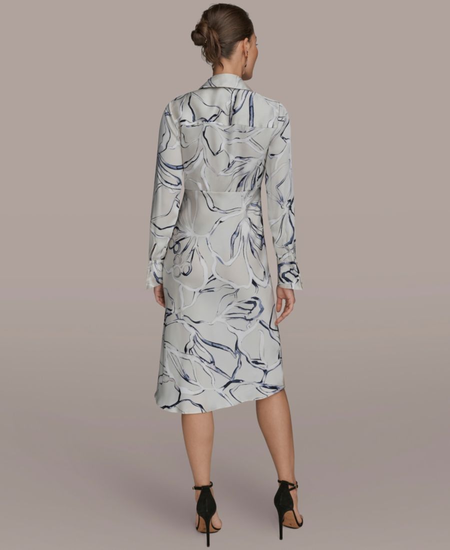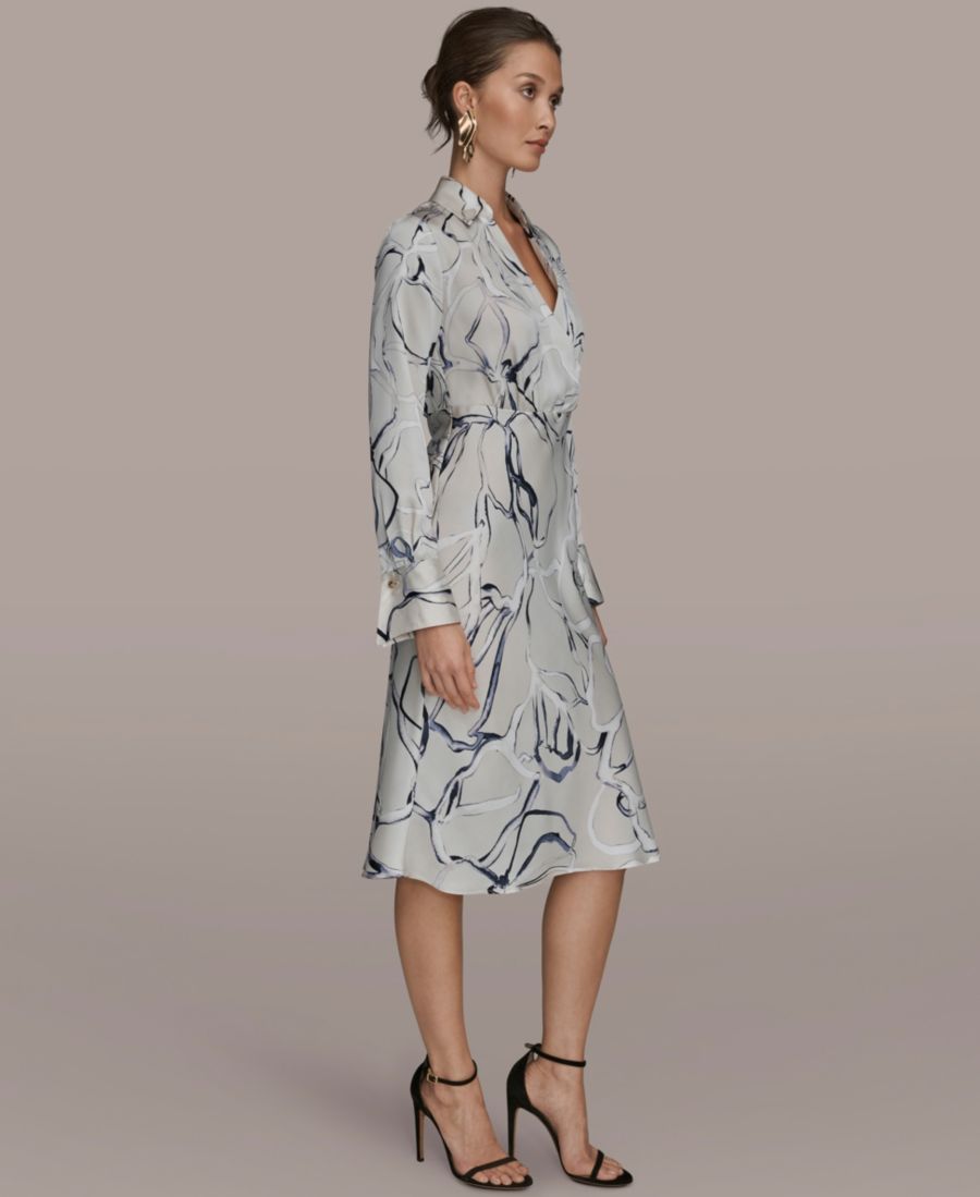 Подчеркните смелый художественный абстрактный принт с помощью этого платья-рубашки с длинными рукавами и длиной до колена от Donna Karan New York, выполненного в элегантном А-образном силуэте. Воротник и молния на талии придают платью современный и изысканный вид.