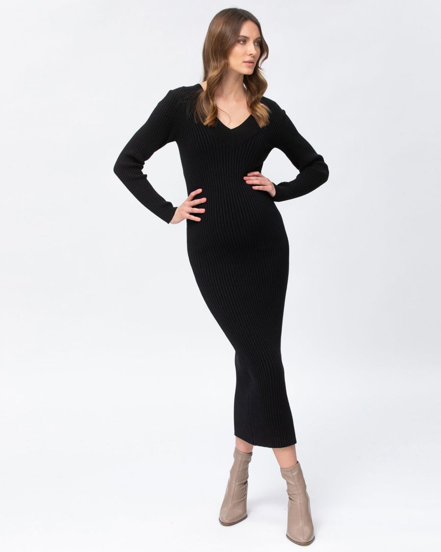 Платье для беременных с длинными рукавами, облегающим кроем и V-образным вырезом. V-образный вырез, также присутствующий на спине, и длина миди придают ему изысканный шарм. Эластичная ребристая ткань идеально облегает силуэт и делает платье очень удобным в носке.