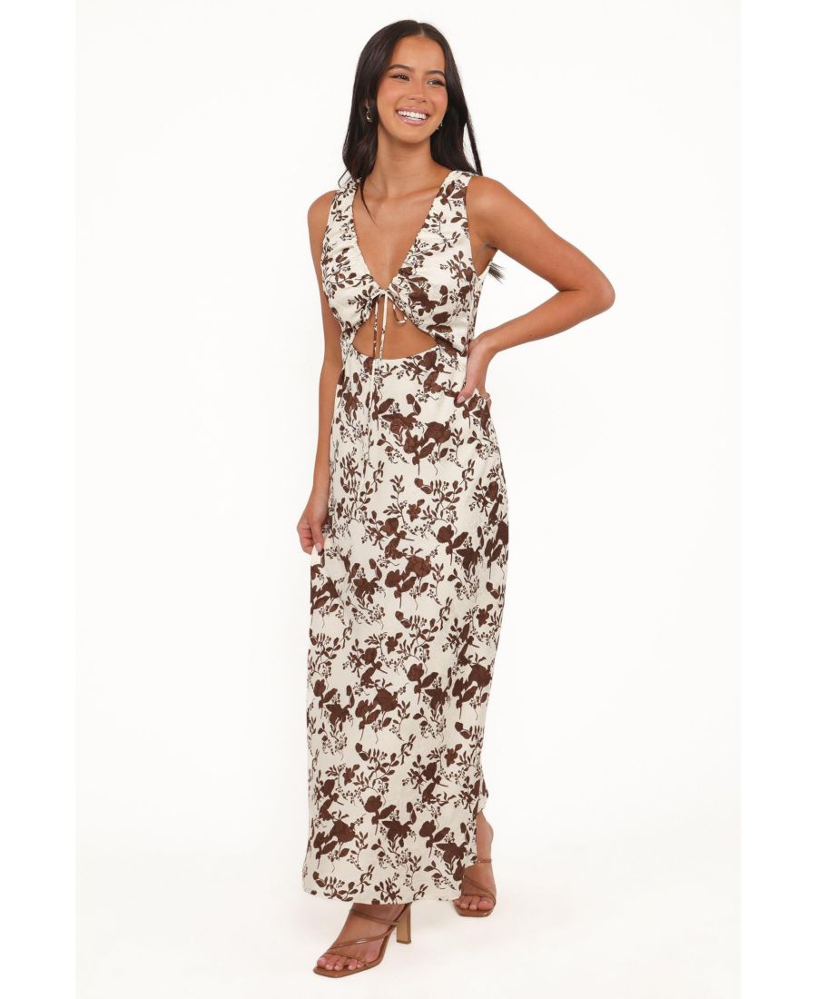 В макси-платье Noemi с коричневым цветочным принтом вы без труда привлечете всеобщее внимание - ваш идеальный выбор для создания эффектного образа. Это макси-платье без рукавов с асимметричным вырезом и изящной завязкой сочетает в себе легкость и элегантность.