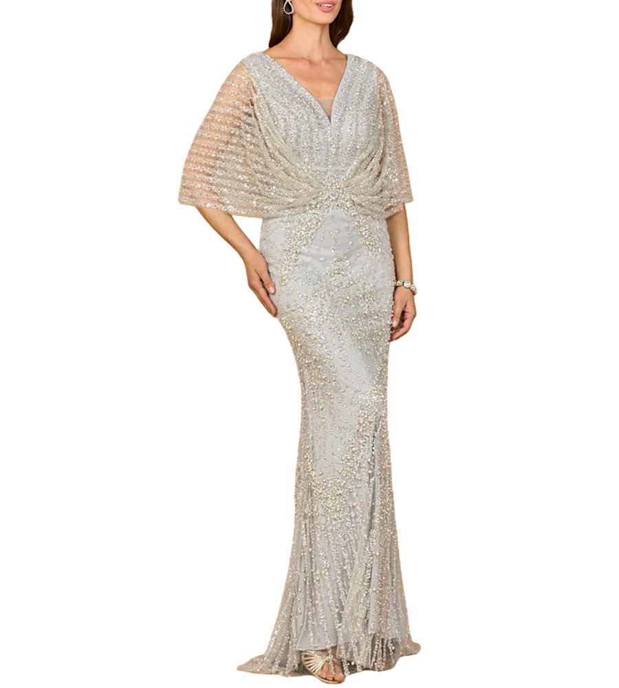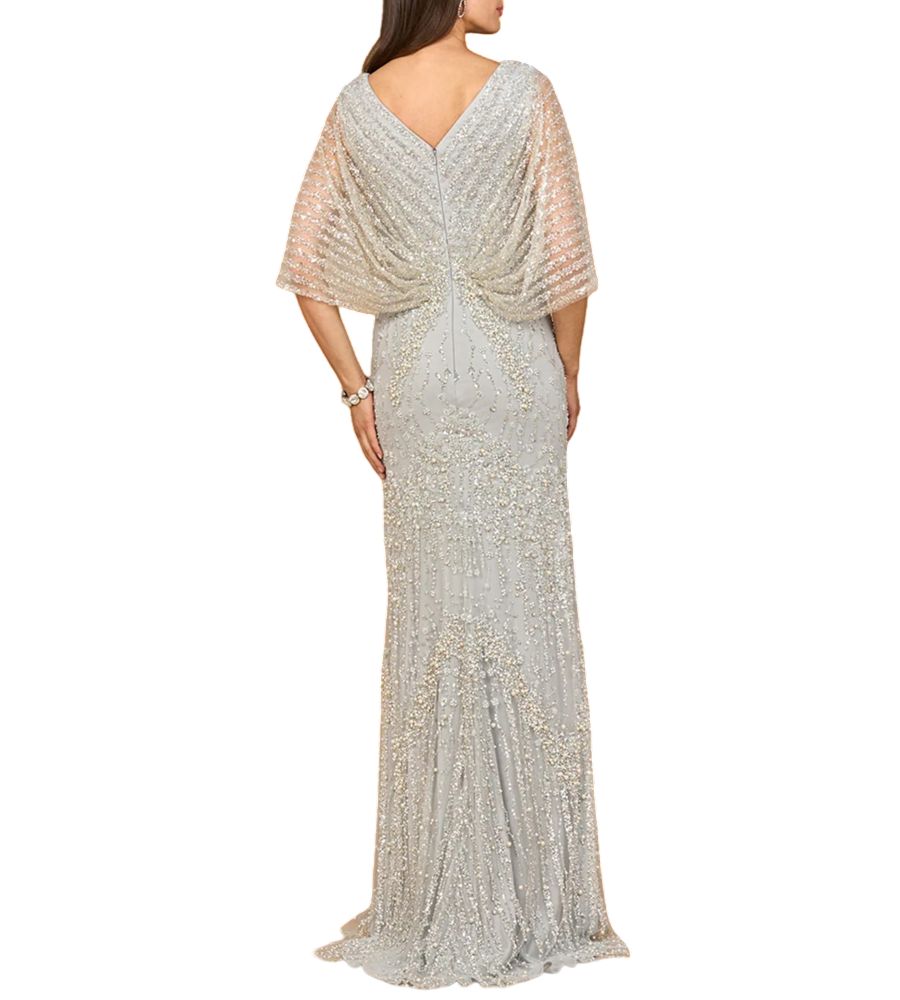 Это платье-русалка, украшенное изысканным кружевом с бисером, излучает утонченность и роскошь. Эффектные рукава-кейп и V-образный вырез добавляют гламура, делая его идеальным выбором для любой матери невесты. Подчеркните свой стиль этим эксклюзивным дизайном.