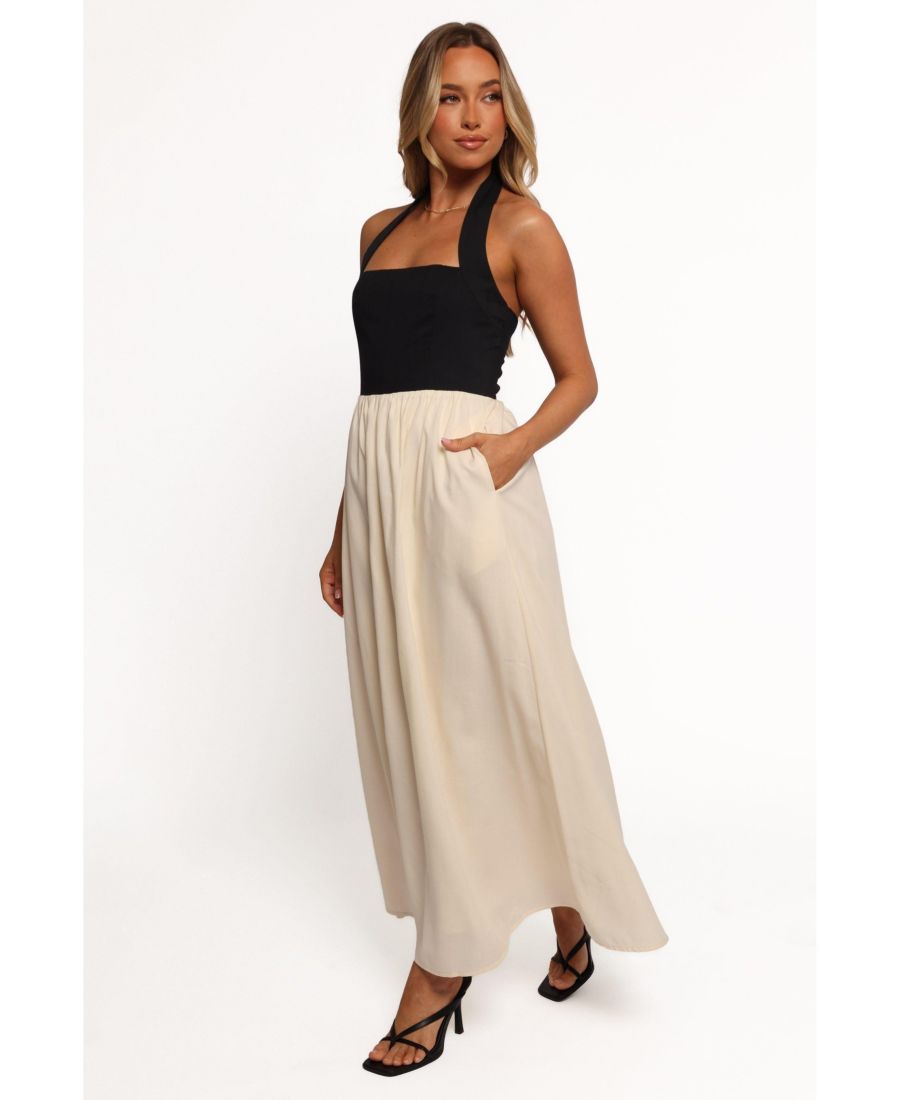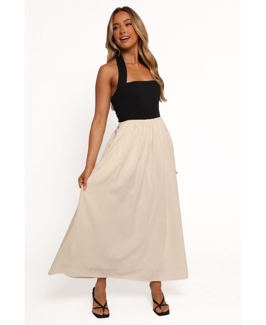 Это потрясающее платье сочетает в себе современный квадратный вырез и эластичный воротник-халтер, обеспечивая комфорт и стиль в одном изящном дизайне. Кремовая контрастная юбка А-силуэта добавляет нотку изысканности, которая красиво струится при каждом шаге.