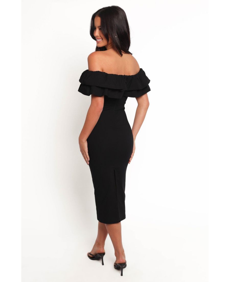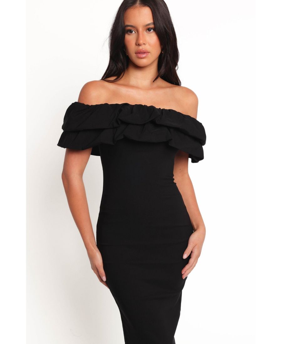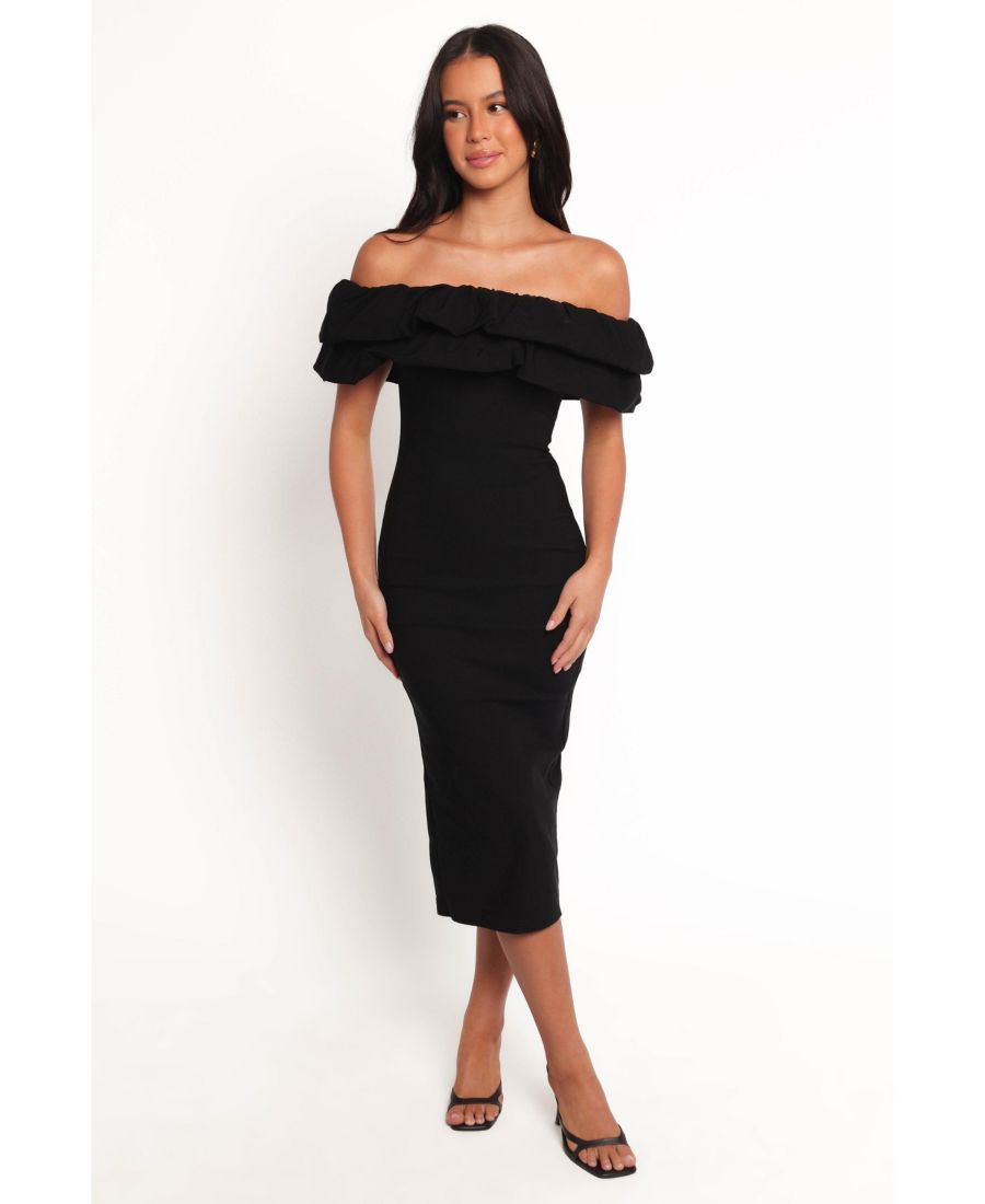 Это платье средней длины с открытыми плечами, выполненное в универсальном стиле, излучает сдержанную элегантность. Прямой вырез горловины дополнен многослойными оборками и короткими, игривыми рукавами с оборками, что придает образу текстуру и объем.