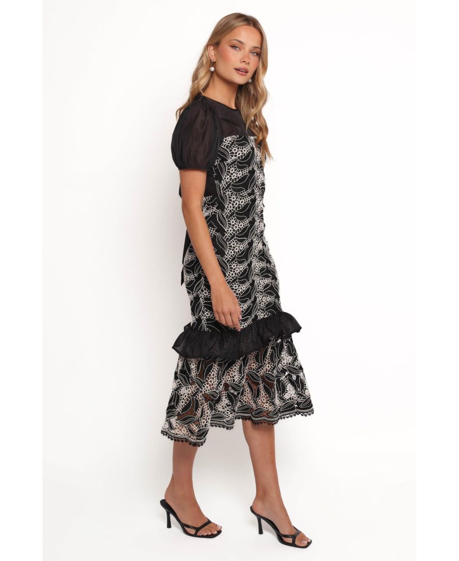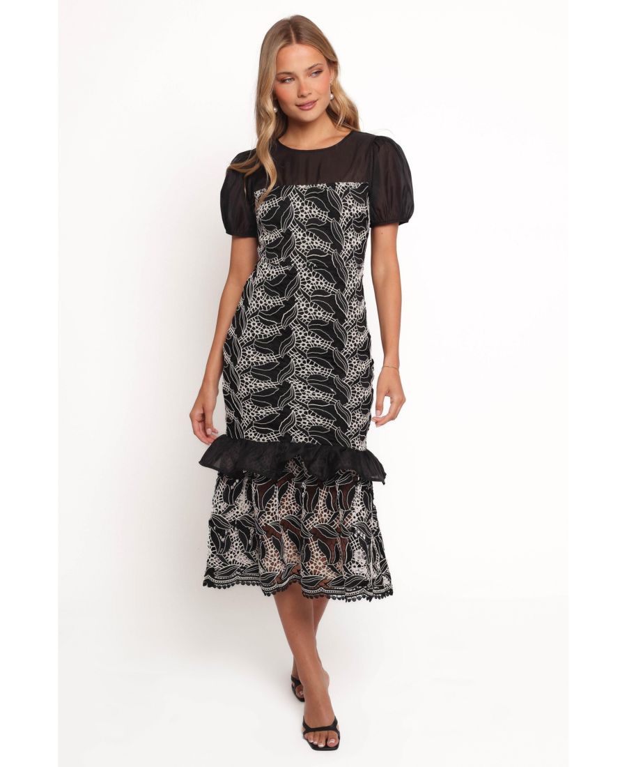 Это платье идеально сочетает в себе модные тенденции и вневременную классику благодаря своей изящной длине миди и стильному круглому вырезу. Короткие пышные рукава добавляют нотку игривости, а кружевная отделка подчеркивает утонченность.