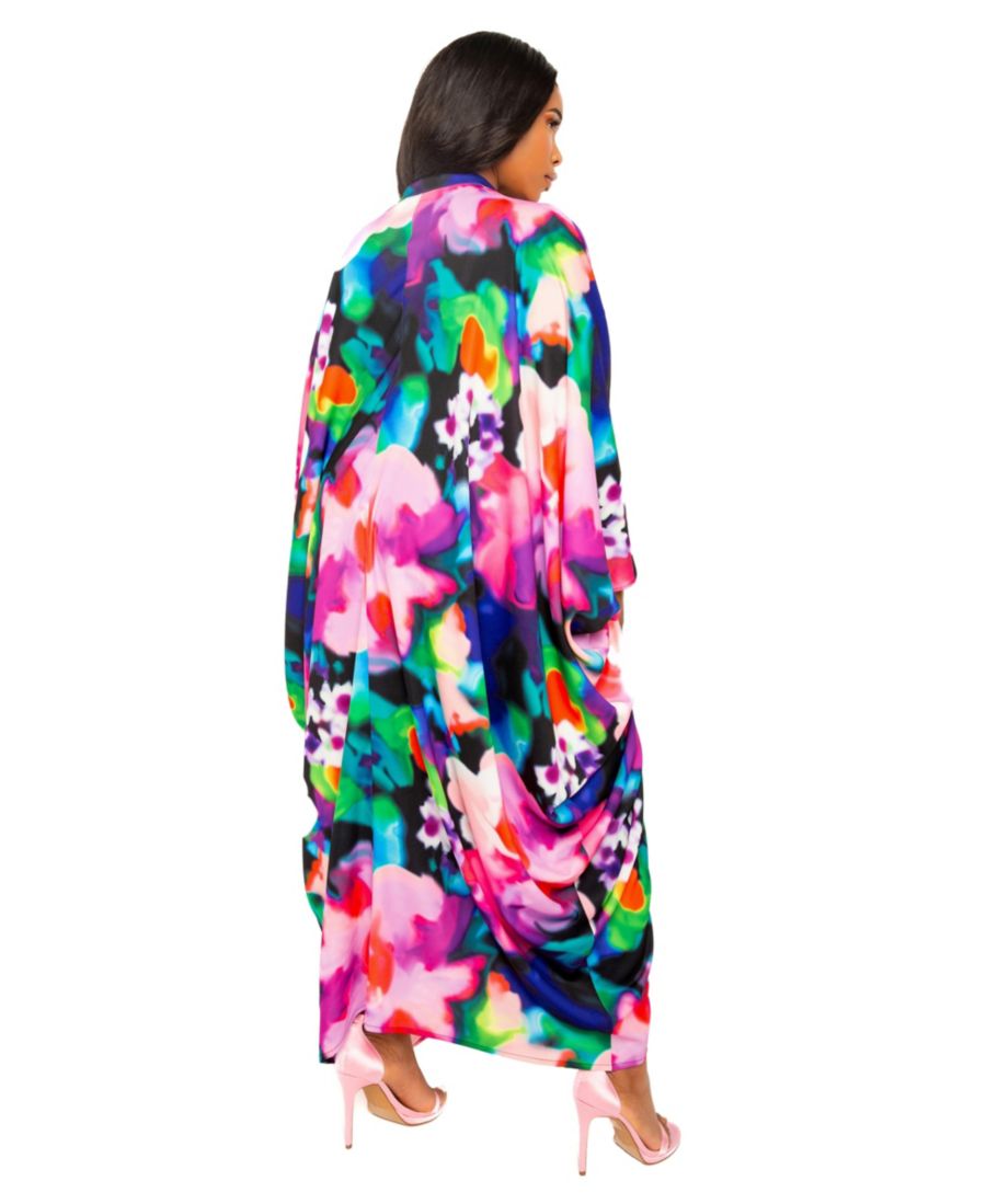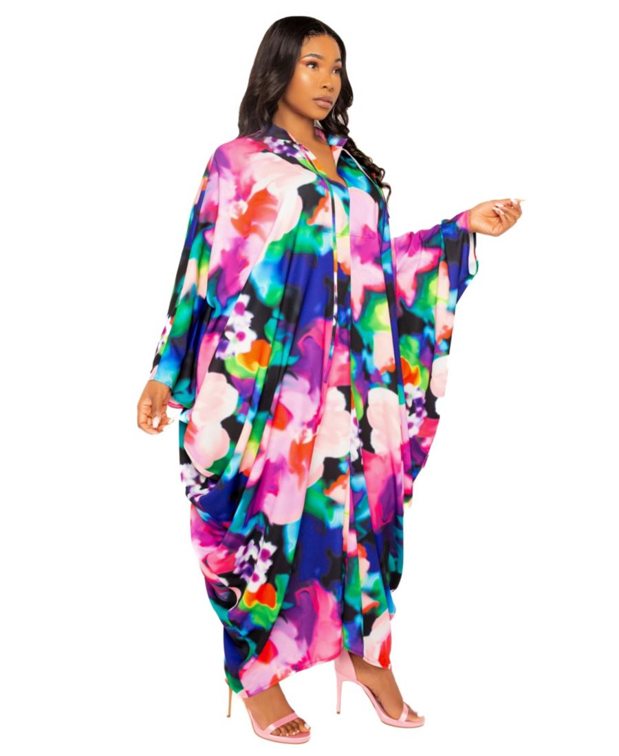 Платье-кафтан с ярким абстрактным принтом создано для комфорта и элегантности. Свободный, струящийся силуэт обеспечивает комфортную посадку, а V-образный вырез с завязками и драпированные рукава позволяют создавать разнообразные образы.