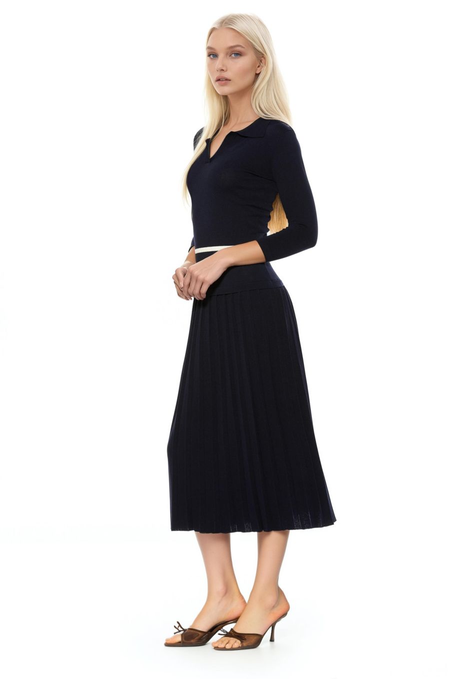Платье-миди Sable Fully Fashion из трикотажа с плиссировкой - обязательный элемент вашего гардероба. Платье отличается роскошной трикотажной отделкой, воротником, плиссированной юбкой и рукавами 3/4. Размер соответствует стандартному.