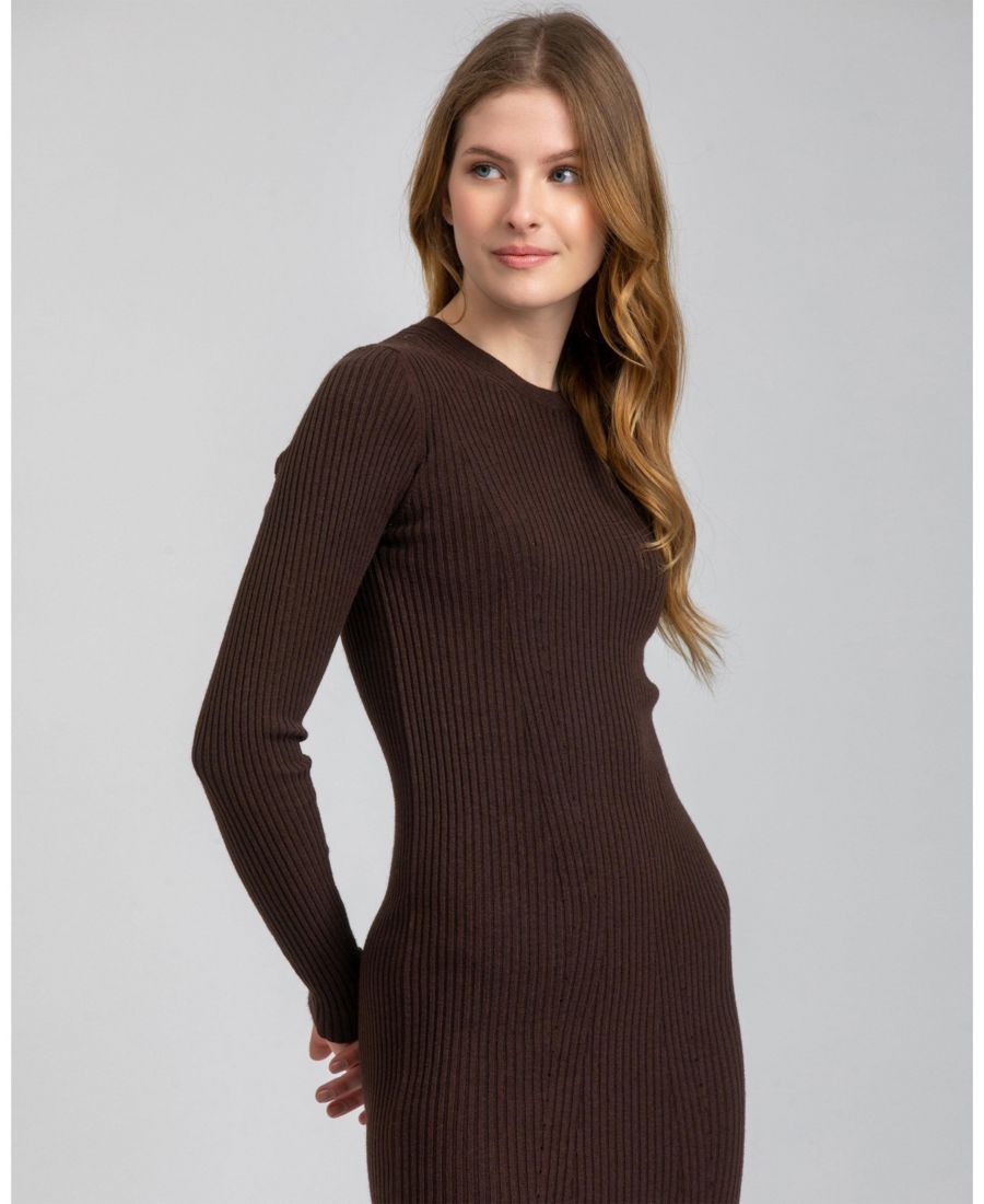 Это облегающее платье с длинными рукавами имеет классический круглый вырез и элегантную длину миди. Изготовленное из очень эластичного ребристого трикотажа, оно идеально облегает фигуру, обеспечивая комфорт и подчеркивая достоинства.