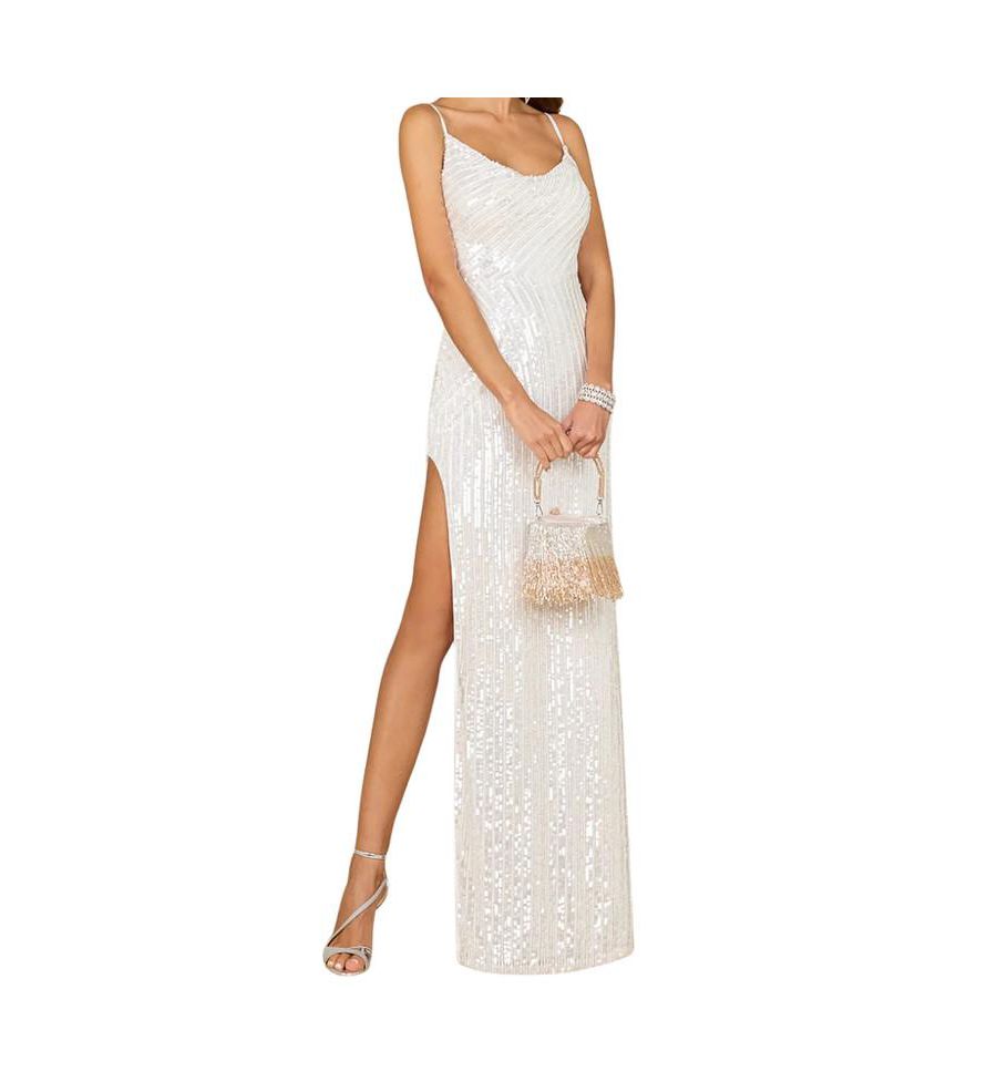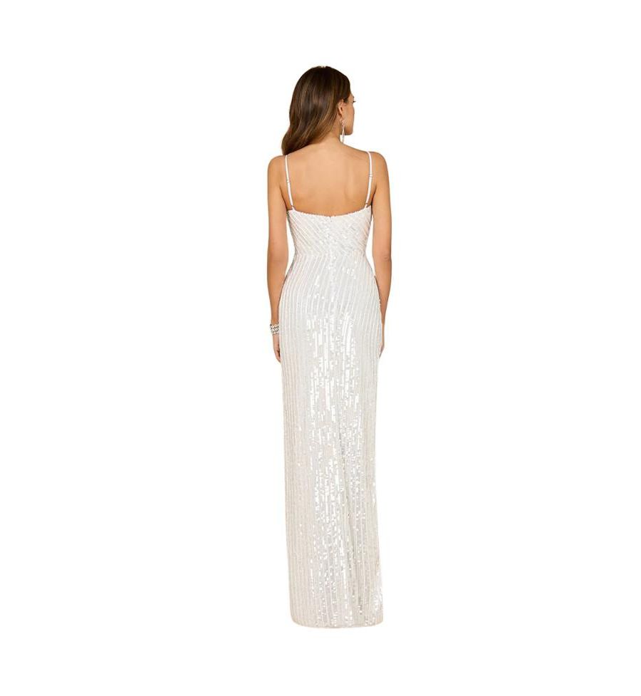 Платье с пайетками и высоким разрезом, переливающегося цвета слоновой кости. Вырезы на талии подчеркивают фигуру и создают эффектный образ. Идеально подойдет как для переодевания на свадебном приеме, так и для репетиционного ужина!