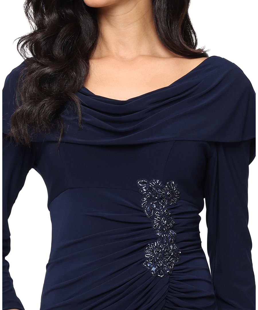 Длинное платье Alex Evenings с драпировкой спереди и сзади, украшенное сборками на талии, создает привлекательный силуэт. Матовая отделка придает платью элегантность и изысканность, идеально подходящие для торжественных случаев.