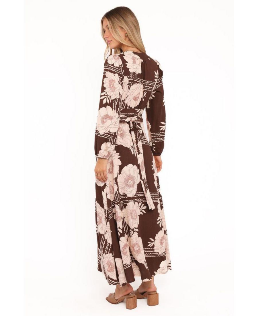 Окунитесь в мир непринужденной элегантности с платьем-миди Safia в коричневом цветочном принте. Идеально скроенное в классическом стиле с запахом, оно имеет макси-длину и V-образный вырез, который подойдет для любого случая.
