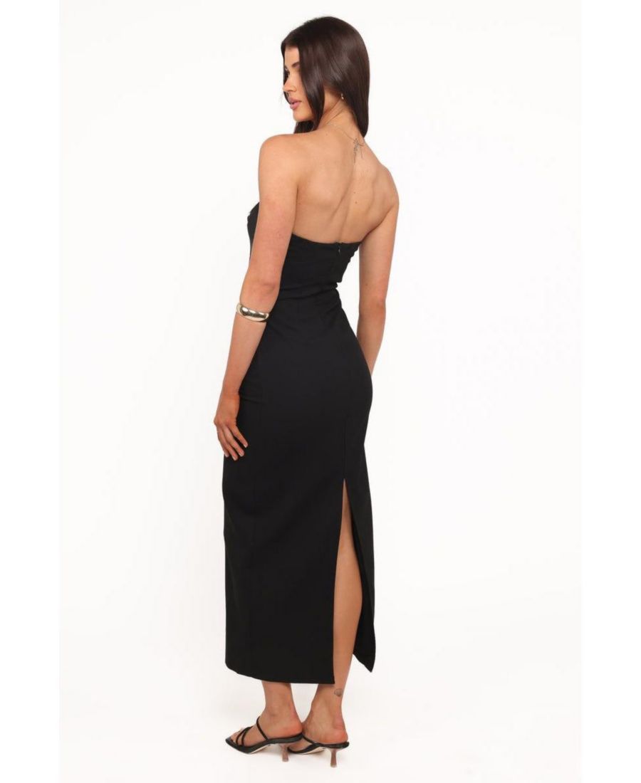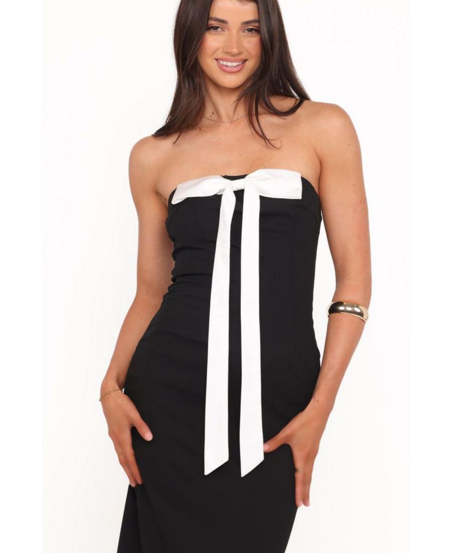 Произведите незабываемое впечатление с макси-платьем Aggie черного цвета. Это потрясающее платье отличается элегантным дизайном без бретелей и классическим прямым вырезом, изящно подчеркнутым декоративным бантом на груди.