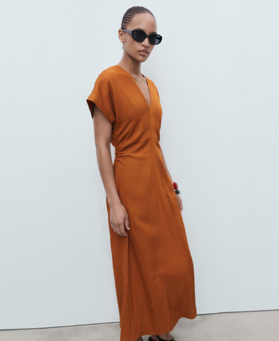 Платье-миди с присборенными боками от Mango, созданное с учетом объема, мягко подчеркивает фигуру. Изготовленное из струящейся ткани, это платье-миди имеет А-образный силуэт, короткие рукава и присборенную талию.