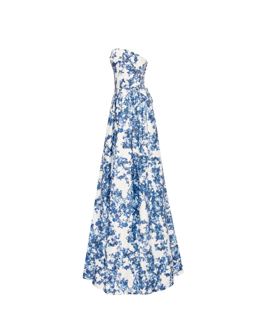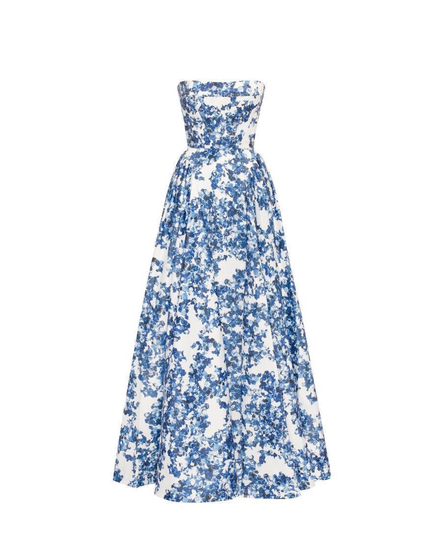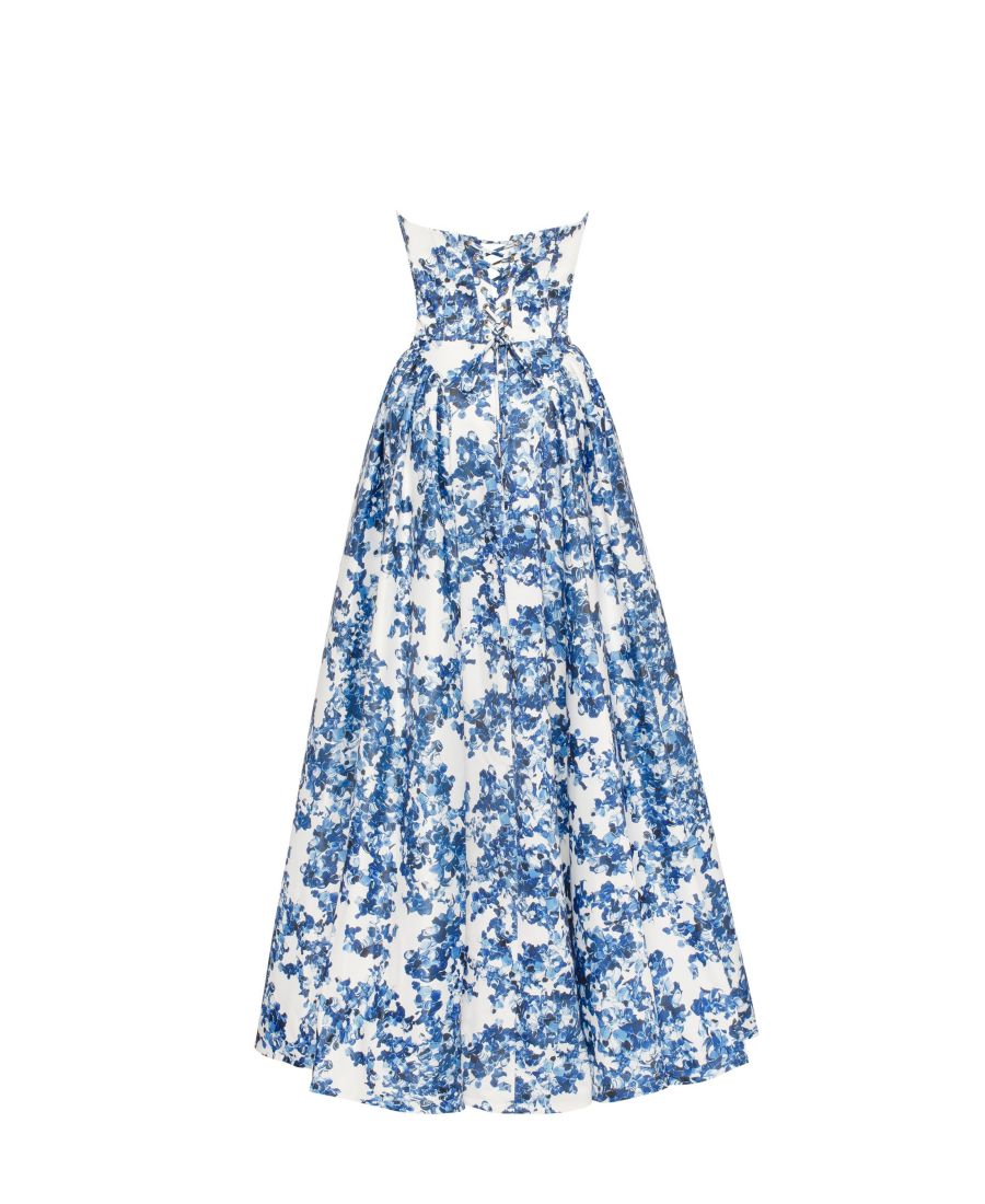 Длинное платье А-силуэта, сшитое из атласной ткани с узором, напоминающим о прекрасном летнем сезоне. Оно имеет корсетный лиф со шнуровкой, фирменный серебряный пояс Milla на талии и объемную расклешенную юбку.