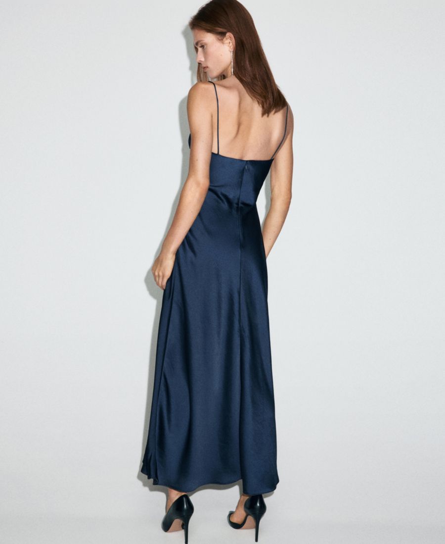 Подчеркните вечернюю элегантность с помощью атласного платья с V-образным вырезом от Mango. Изготовленное из атласной ткани, оно имеет длинный прямой крой с тонкими бретелями, без рукавов и присборенную грудь.