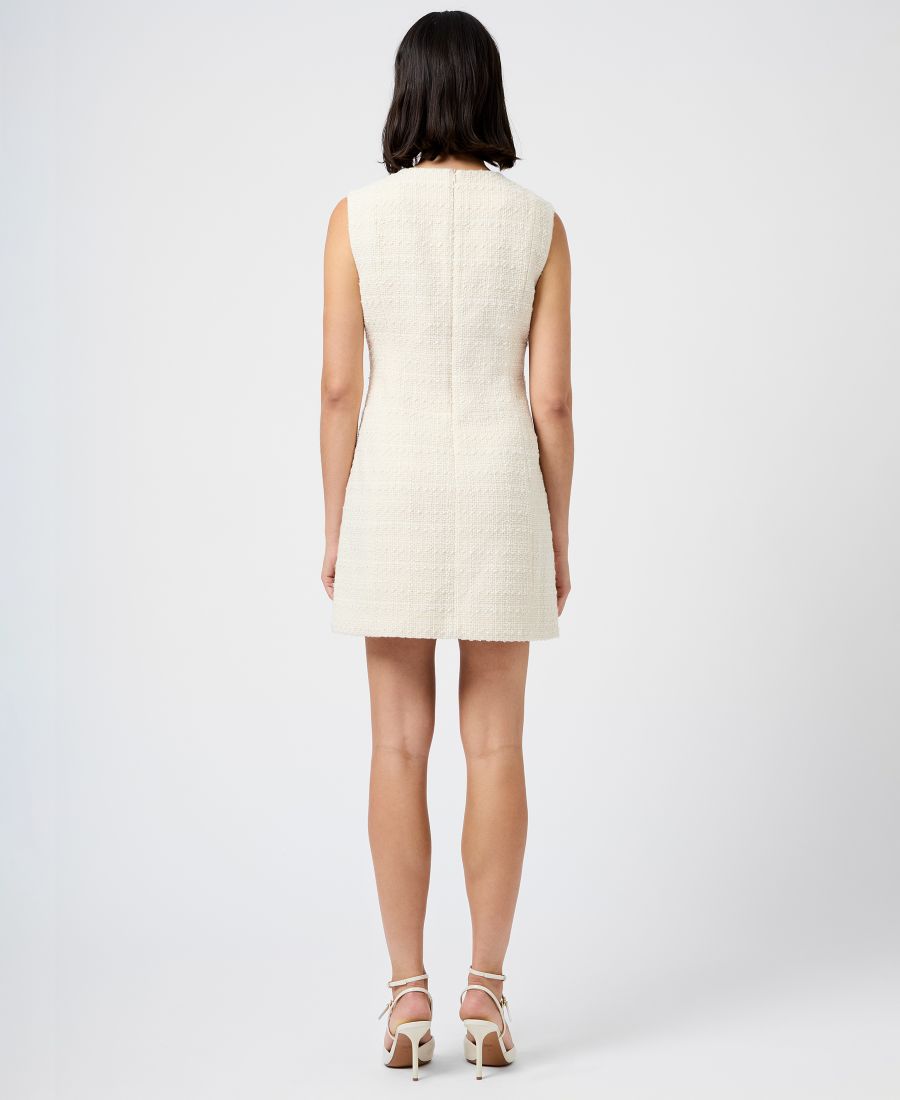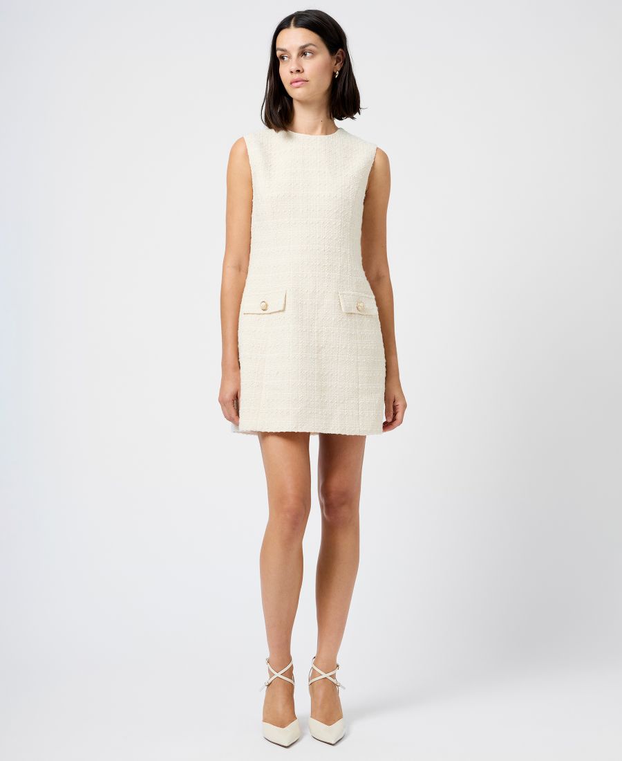 Это мини-платье от French Connection, сшитое из фактурного твида, отличается элегантным и строгим силуэтом. Два нефункциональных передних кармана и круглый вырез горловины добавляют практичности и стиля.
