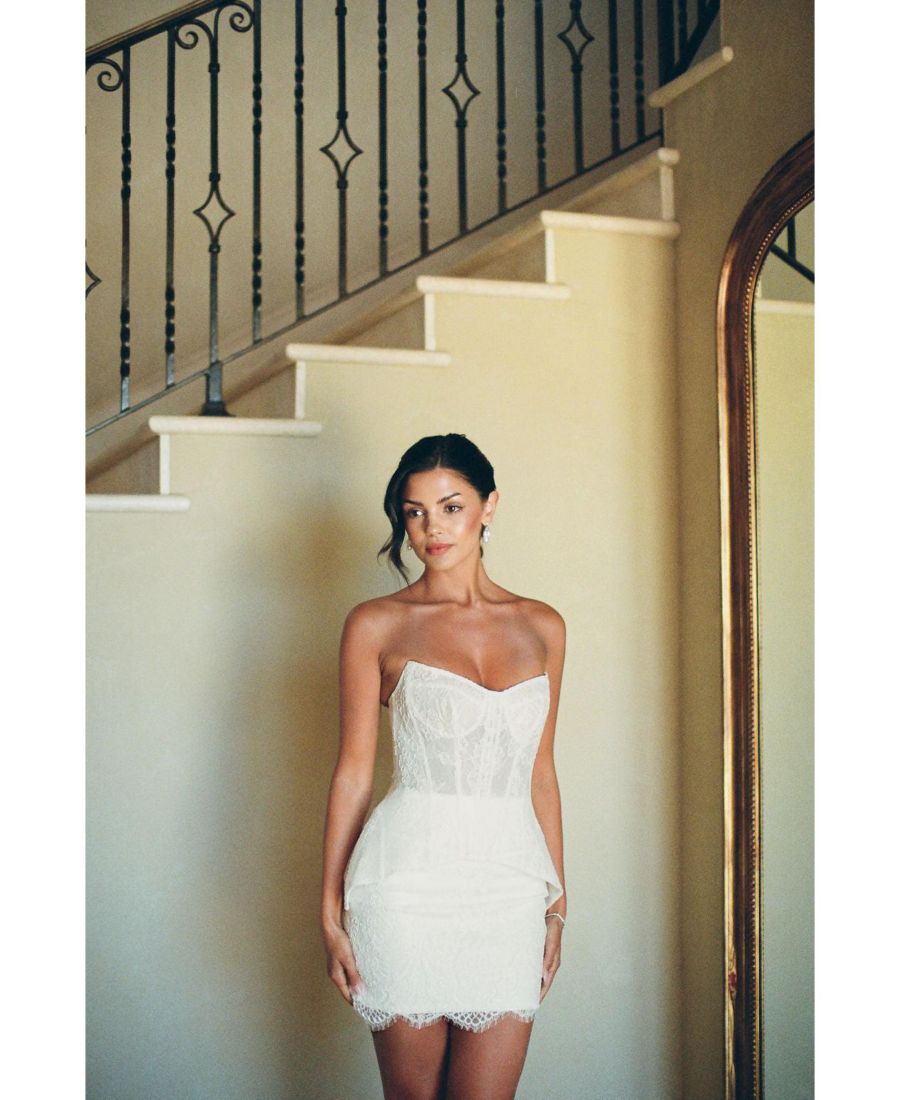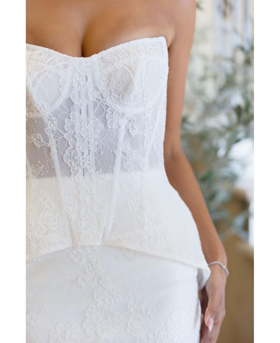 Платье Giselle создано для невесты, которая ценит сочетание строгих линий и нежности. Оно отличается корсетным лифом без бретелей, скульптурными деталями в области бедер и восхитительным кружевом!