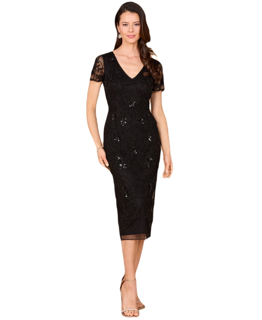 Побалуйте себя роскошью с расшитым бисером миди-платьем Lara 28995. Изысканная вышивка бисером и элегантный V-образный вырез создают утонченный образ, идеально подходящий для матери невесты.