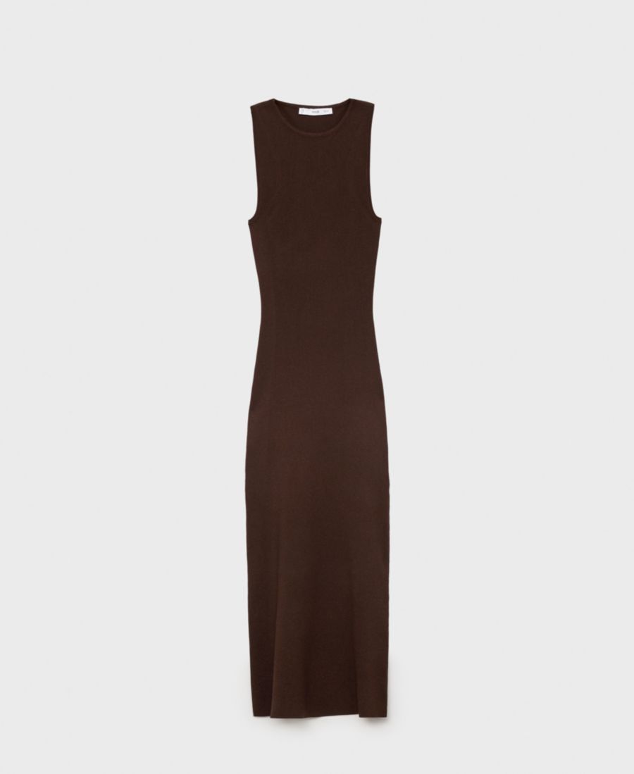 Создайте легкий и элегантный образ с помощью вязаного платья с воротником-халтером от Mango. Это длинное платье имеет облегающий крой, без рукавов, широкие бретели и не застегивается.