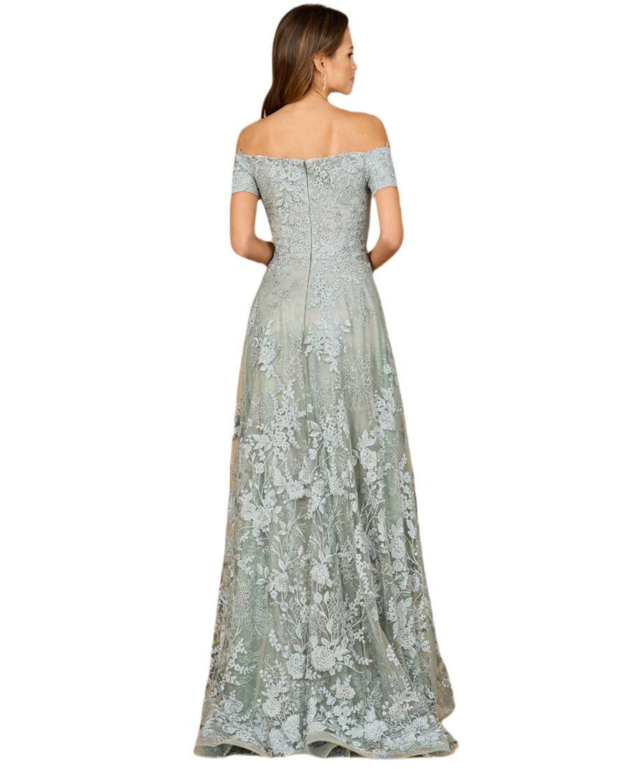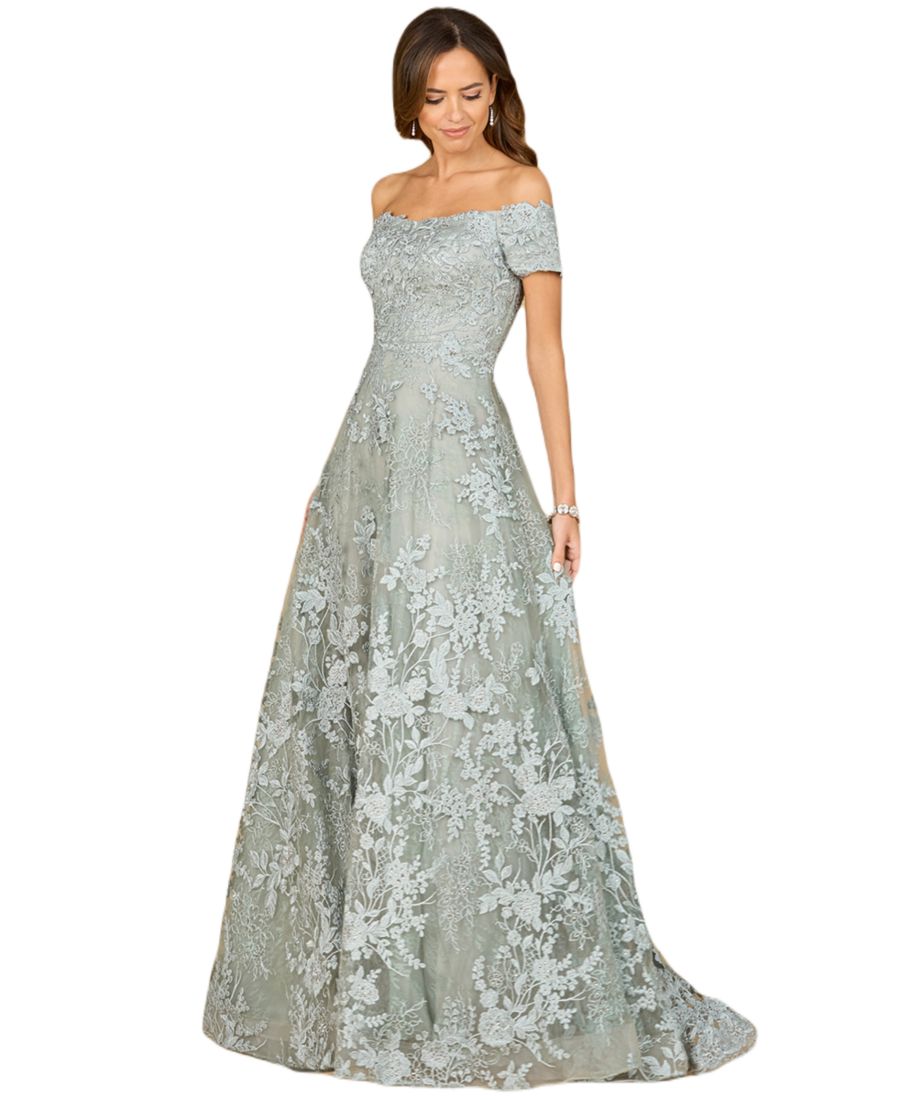 Платье А-силуэта с открытыми плечами, высоким вырезом и кружевной отделкой, украшенное изысканной кружевной аппликацией и сверкающими стразами, создает утонченный и роскошный образ.