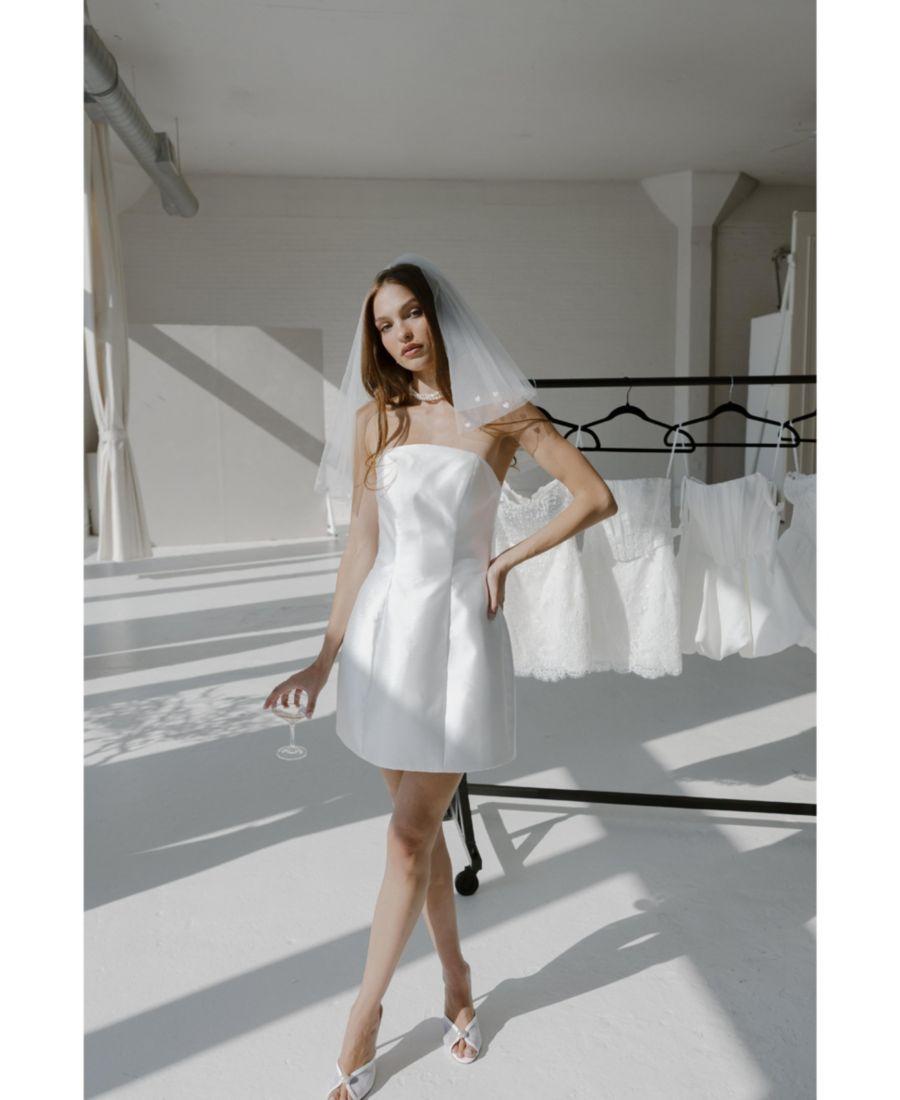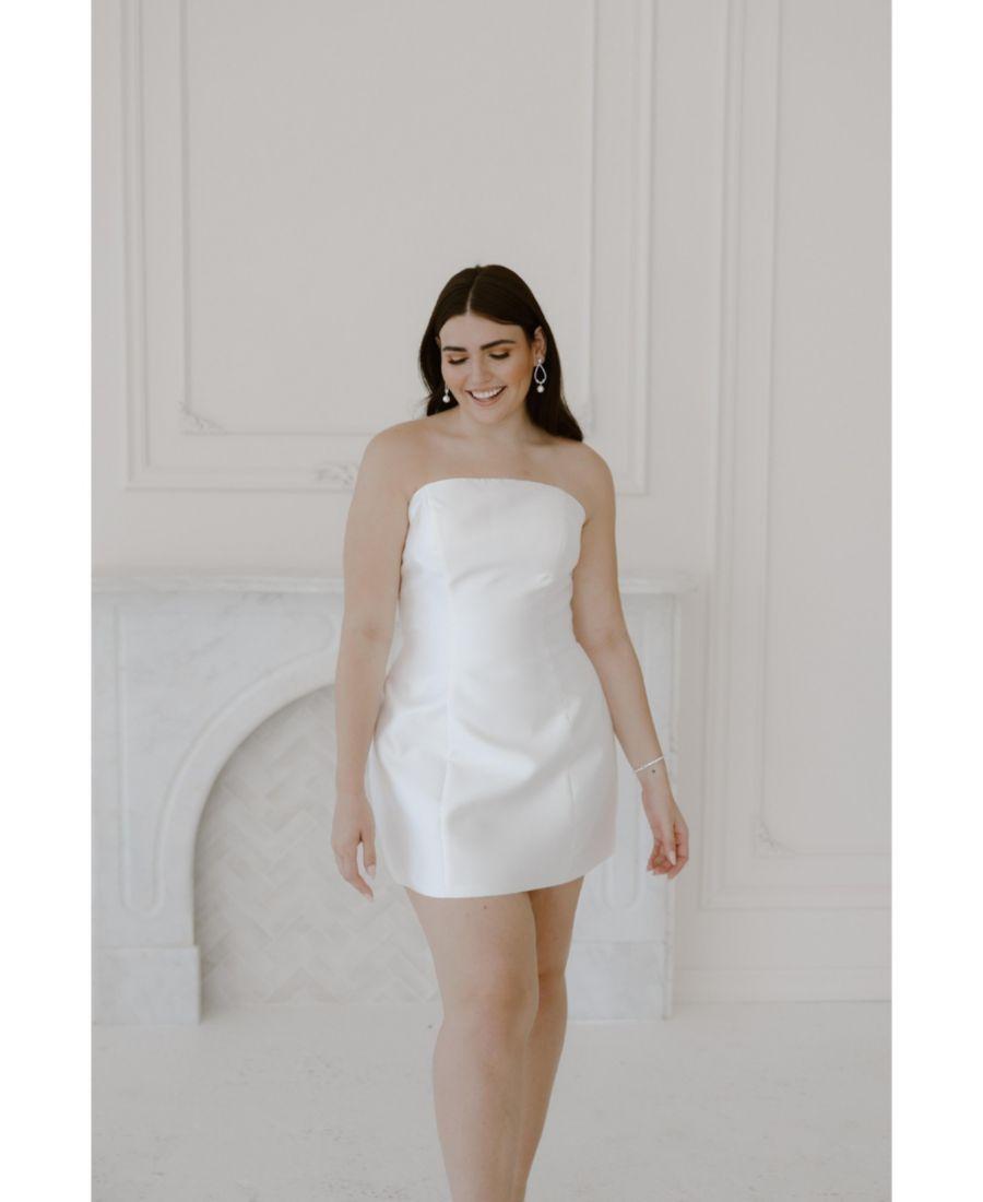 Элегантное, структурированное и невероятно стильное! Bianca - это мини-платье без бретелей из ткани микадо с изогнутым вырезом, облегающим силуэтом и застежкой на пуговицах сзади!