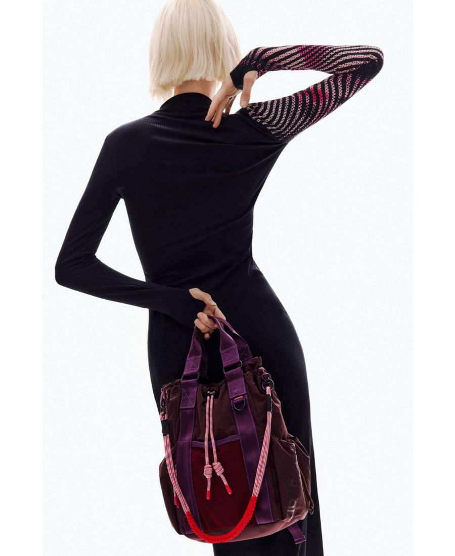 Вязаное платье с длинными рукавами и круглым вырезом, дизайн которого сочетает в себе вставки черного и фиолетового цветов. Длина миди, облегающий крой, эластичная ткань.