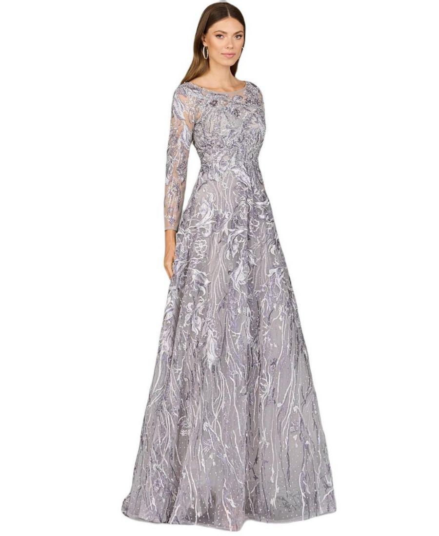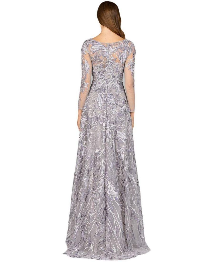 Платье А-силуэта, расшитое бисером, с длинными рукавами и высоким воротником, создающее скромный, но элегантный образ. Полностью расшито разноцветным кружевом и бисером.