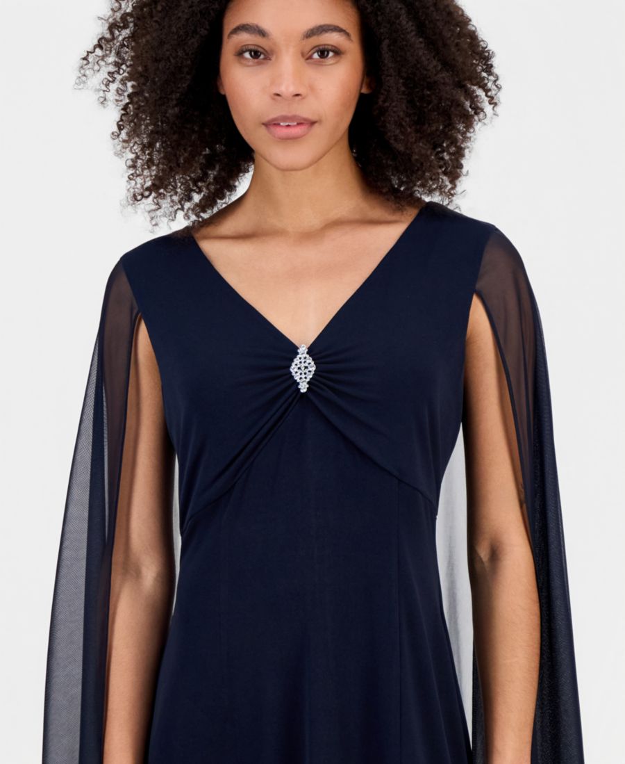 Струящаяся, полупрозрачная накидка этого платья Connected привнесет в ваш вечерний образ изысканности, а драпированный стразами лиф будет выглядеть великолепно.
