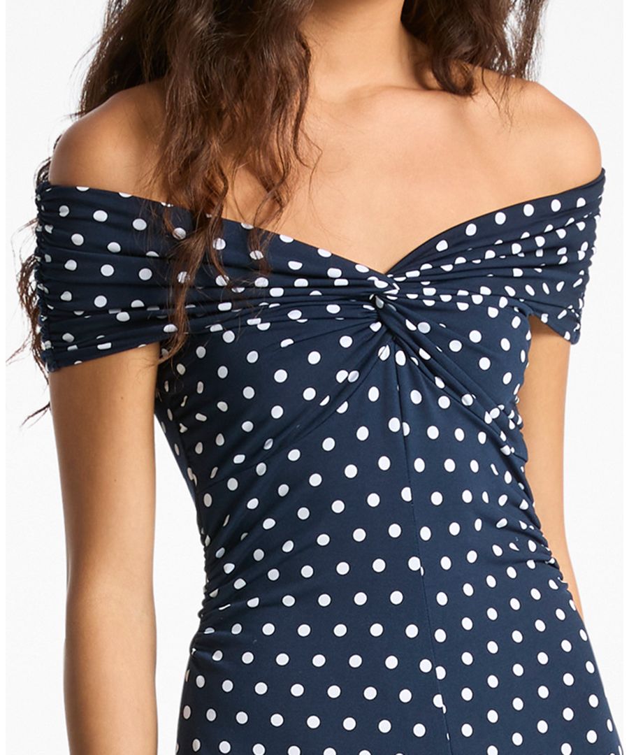 Это стильное миди-платье от Michael Kors с открытыми плечами украшено точечным узором и не имеет рукавов. Боковая молния обеспечивает облегающий силуэт.