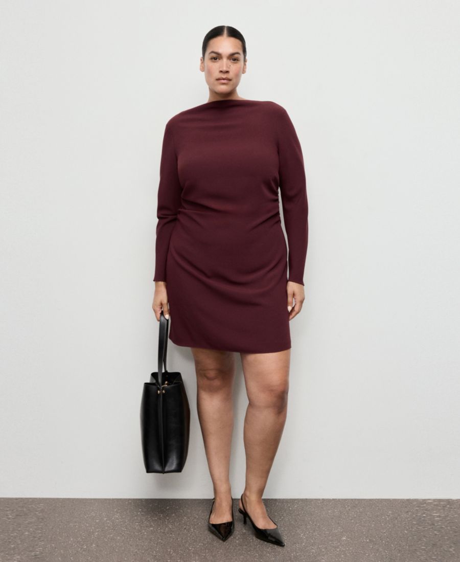 Платье Mango с вырезом-лодочкой и сборками отличается гладким, чистым кроем. Это короткое платье имеет вырез-лодочку, длинные рукава и боковые складки.